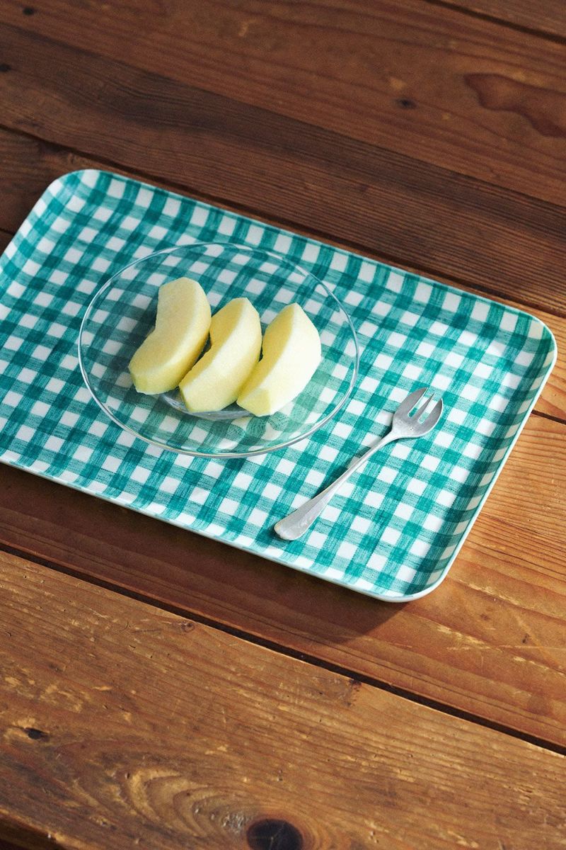 M サイズは、ワンプレートとグラス、カトラリーを置いて。一人分のランチやおやつタイムにちょうど良いサイズ感。