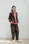 「大きめのクルミボタンで、ジャケットでもかっちりとした感じがせず、クラシカルなかわいらしい雰囲気が気に入りました。後ろにタックが入っているので、着ていても窮屈じゃないのがいいですね。今回はセットアップにしてみましたが、着丈が長すぎないので、スカートやボリュームのあるボトムスとも合わせやすそう。」