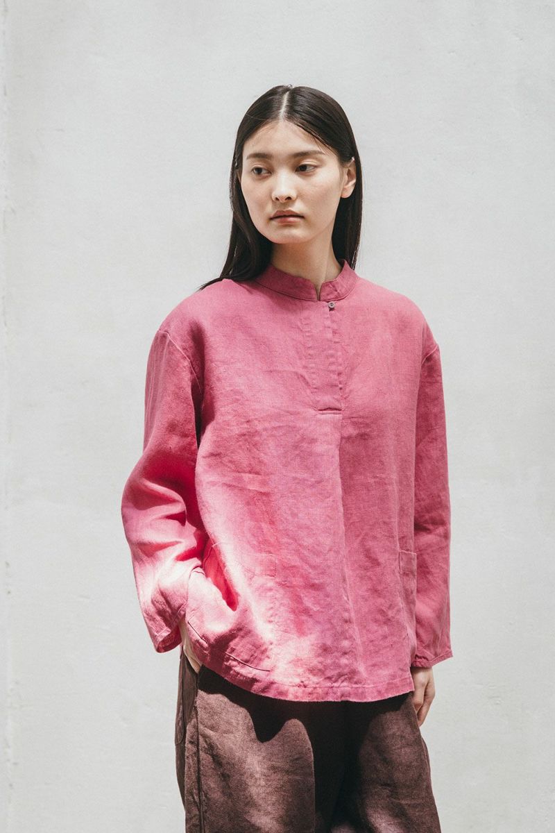 <小さなボタンと大きなポケットがアクセント。バンドカラーのプルオーバー>