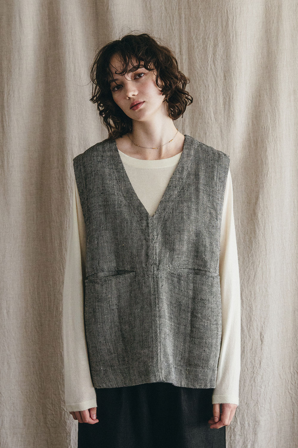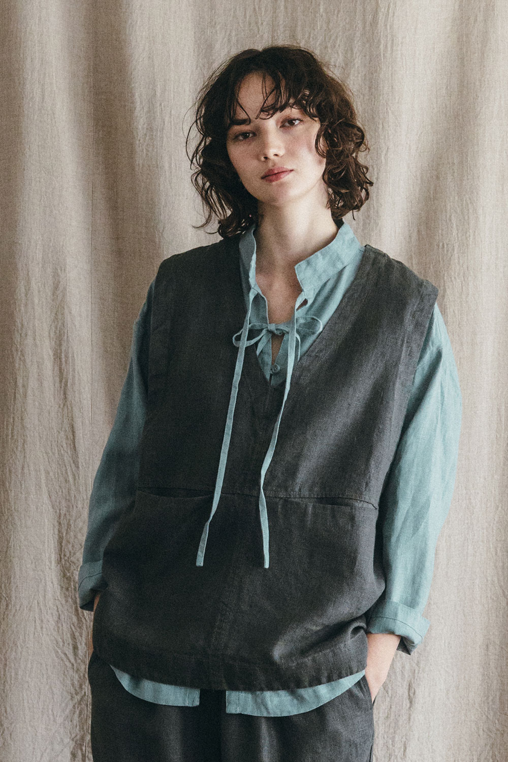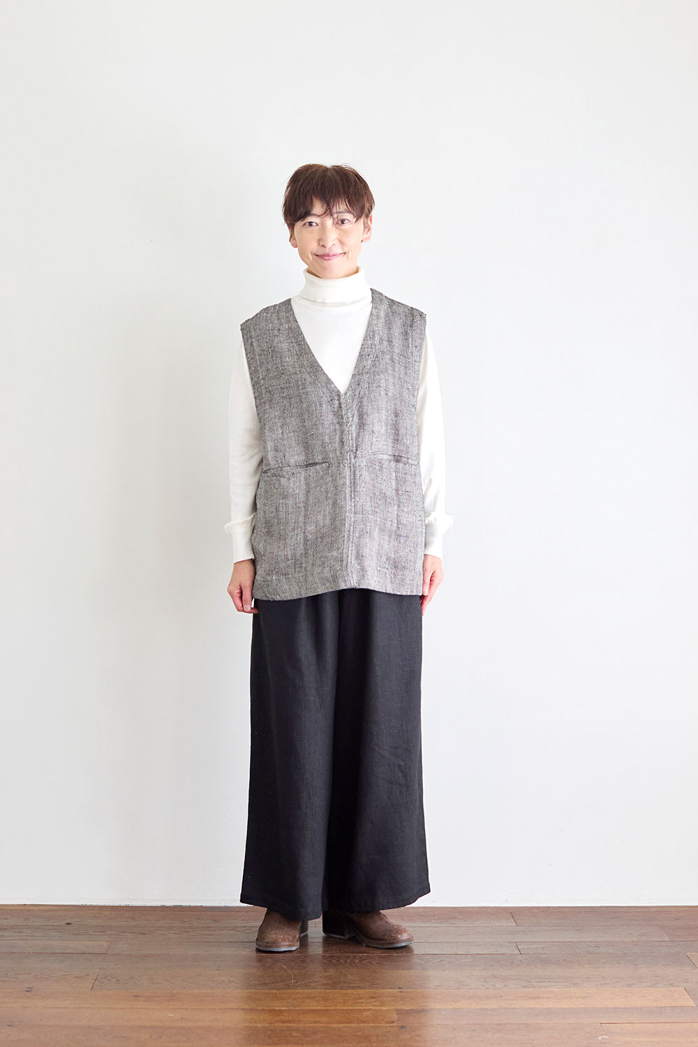 厚手のリネン生地で仕立てた、存在感のあるジレ。