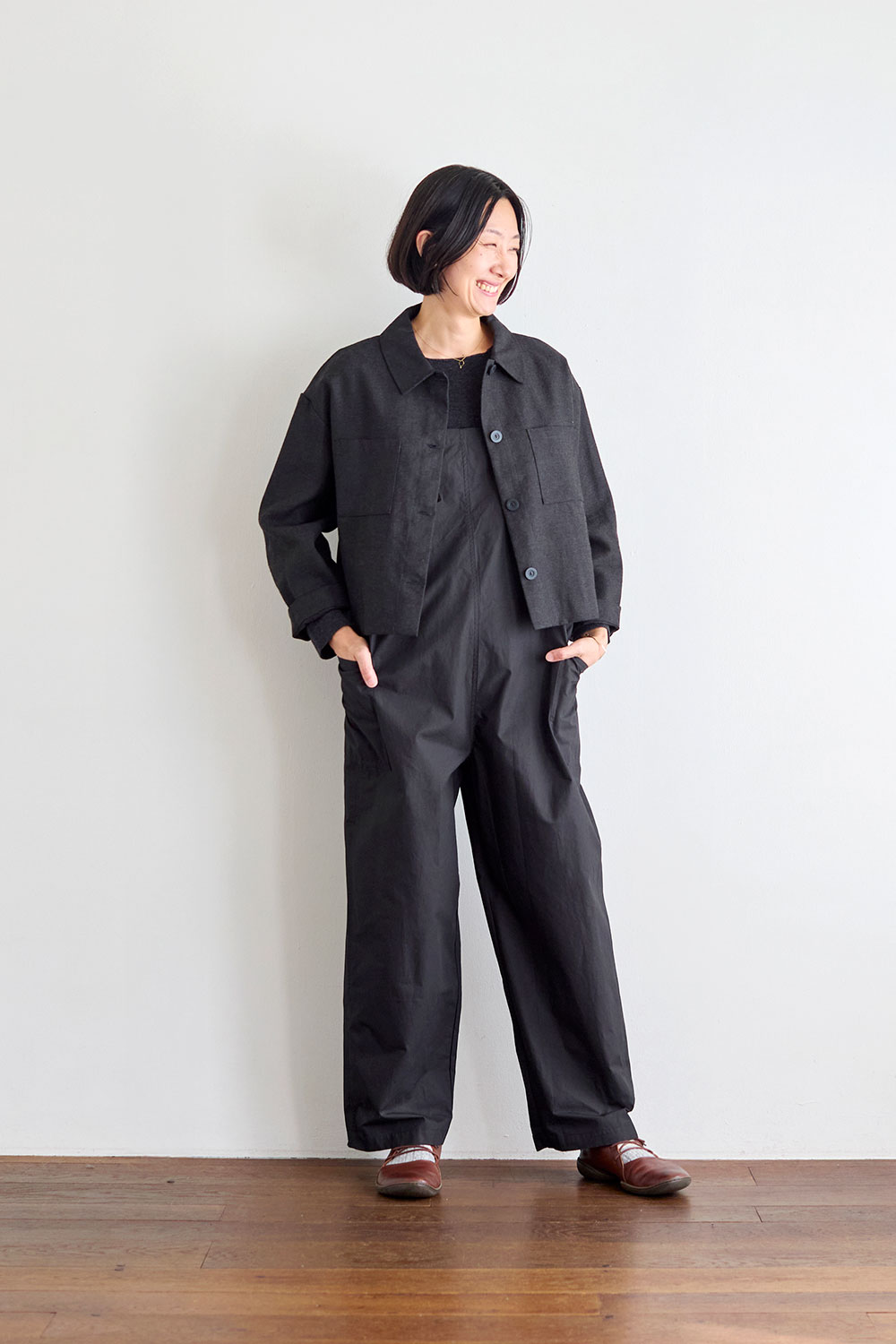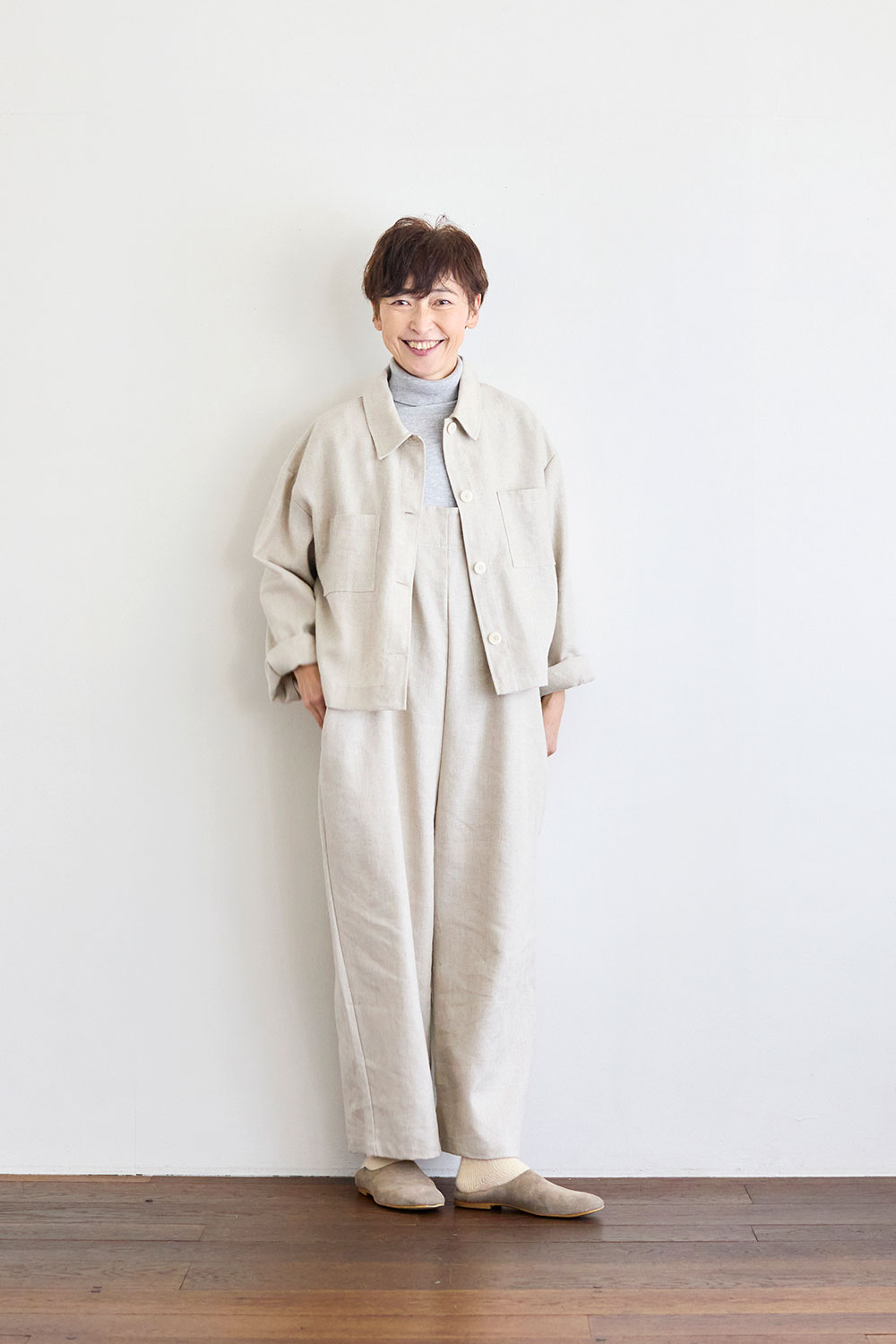 右:身長160㎝ 「ショート丈のおかげで、ワイドパンツやスカートに合わせてもバランスよく決まります。今回は同じ生地のサロペットとあわせてセットアップ風に。ウールリネンの生地は軽くてさらっとしているのに、ほんのりあたたかいので季節の変わり目にちょうどいい感じ。シャツみたいに気軽に羽織れるのもポイントです。袖はまくってバランスをとると、こなれた感じになります。」