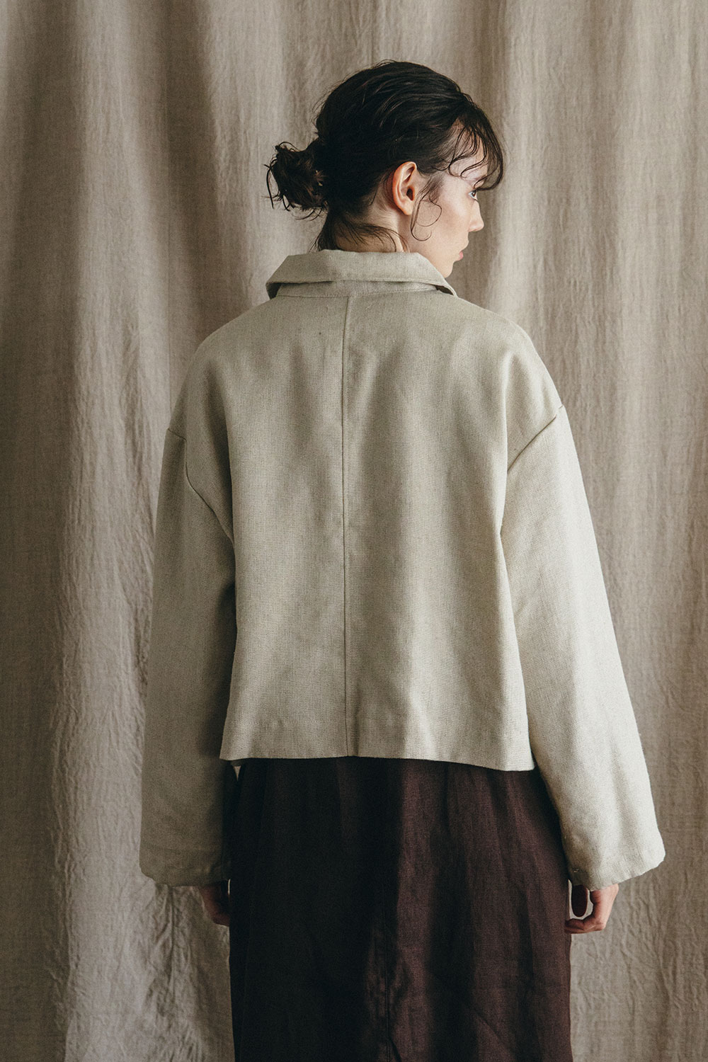 ウールリネンの生地で仕立てた、襟付きのショートジャケット。