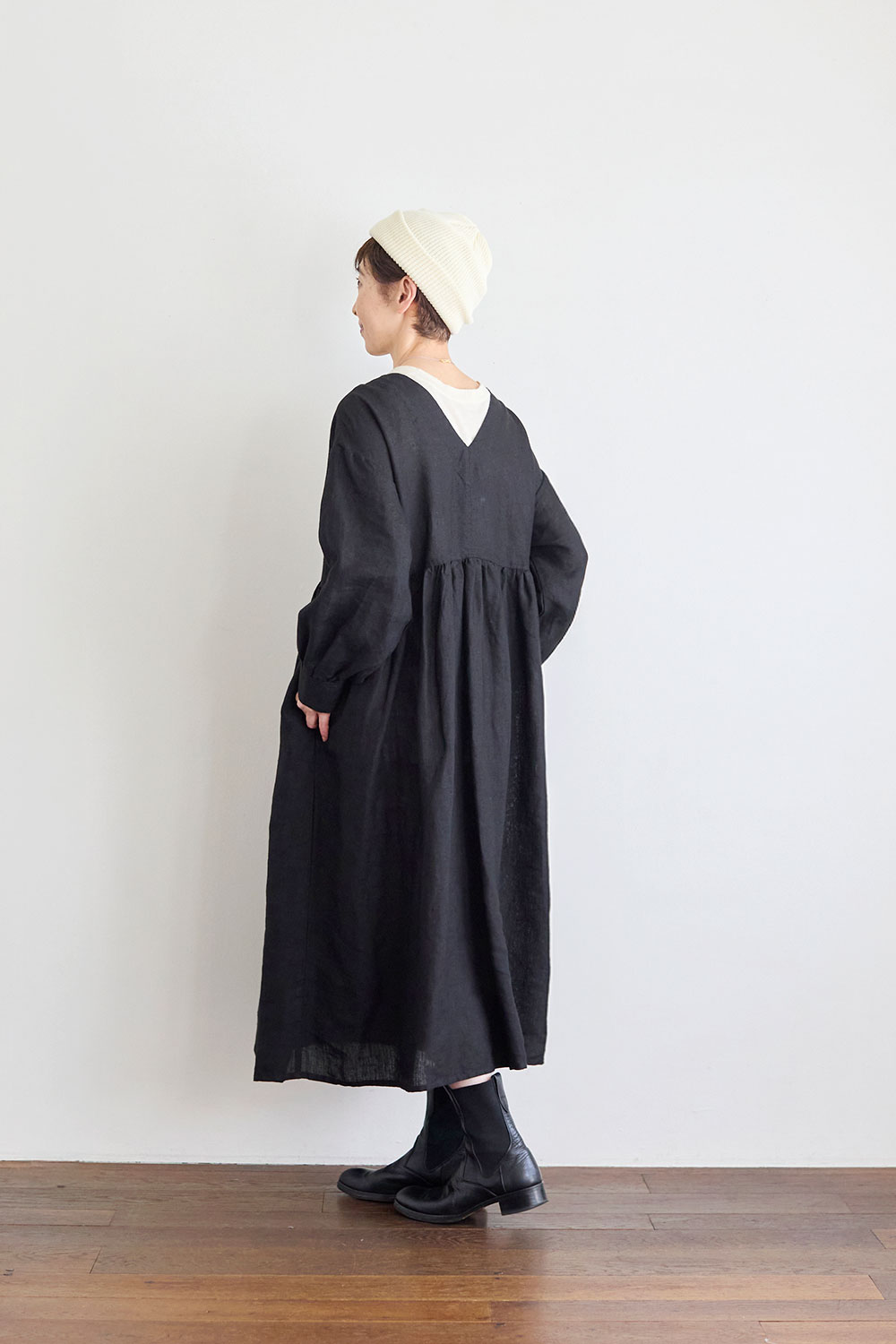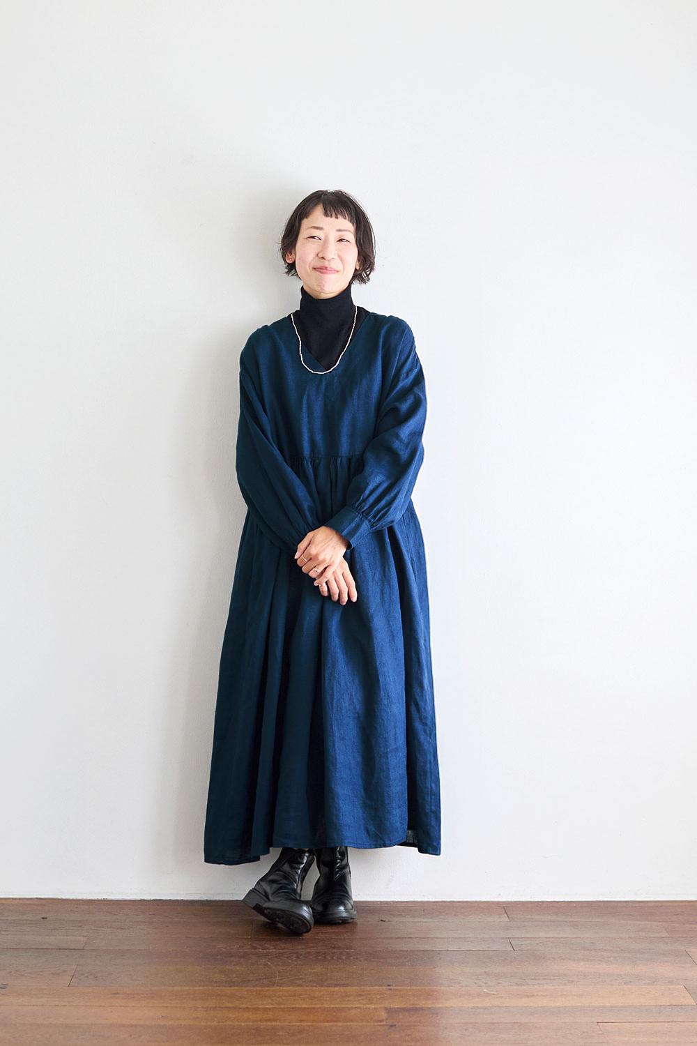 身長153㎝ 「前後で雰囲気が変わるので、その日の気分で着られるのが楽しいワンピースです。今回はVネック側を前にして、ネックレスをあわせてちょっとドレッシーな印象で着用してみました。私が着用すると足首がすこし見えるくらいの着丈で、ブーツやソックス合わせもかわいいと思います」