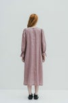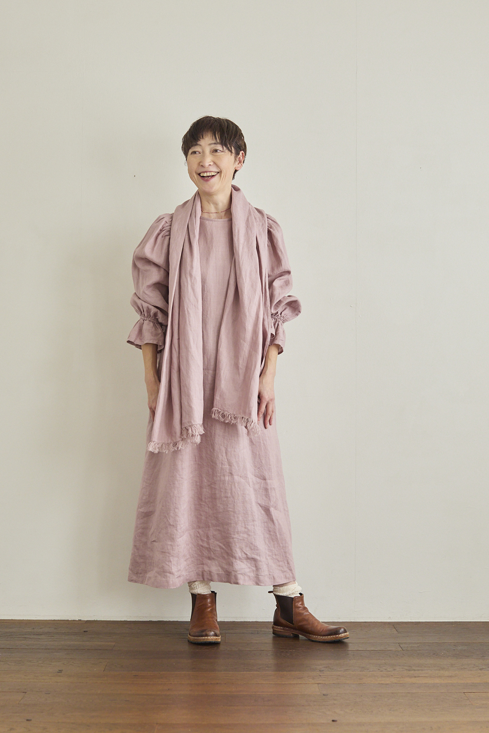 左:身長160㎝ 「1枚でさっと着るだけでサマになるワンピース。袖口はゴム仕様なので、袖丈を調整しやすく、その日の気分やコーディネートに合わせて着こなしを変えられるのがとても便利です。今回は女性らしいローズカラーに、同色の