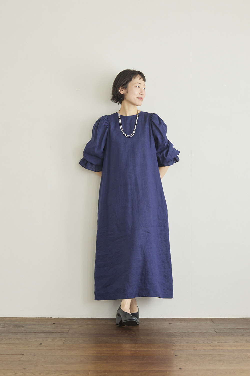 <一枚で着映える、上品なすっきりシルエットのワンピース>袖口のフリルが印象的なワンピース。ややコンパクトな肩幅にはタックをよせ、女性らしいバランスに仕上げました。