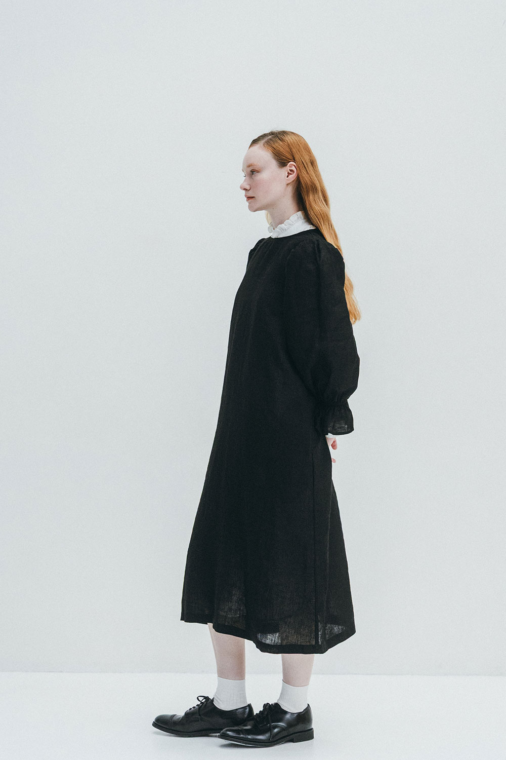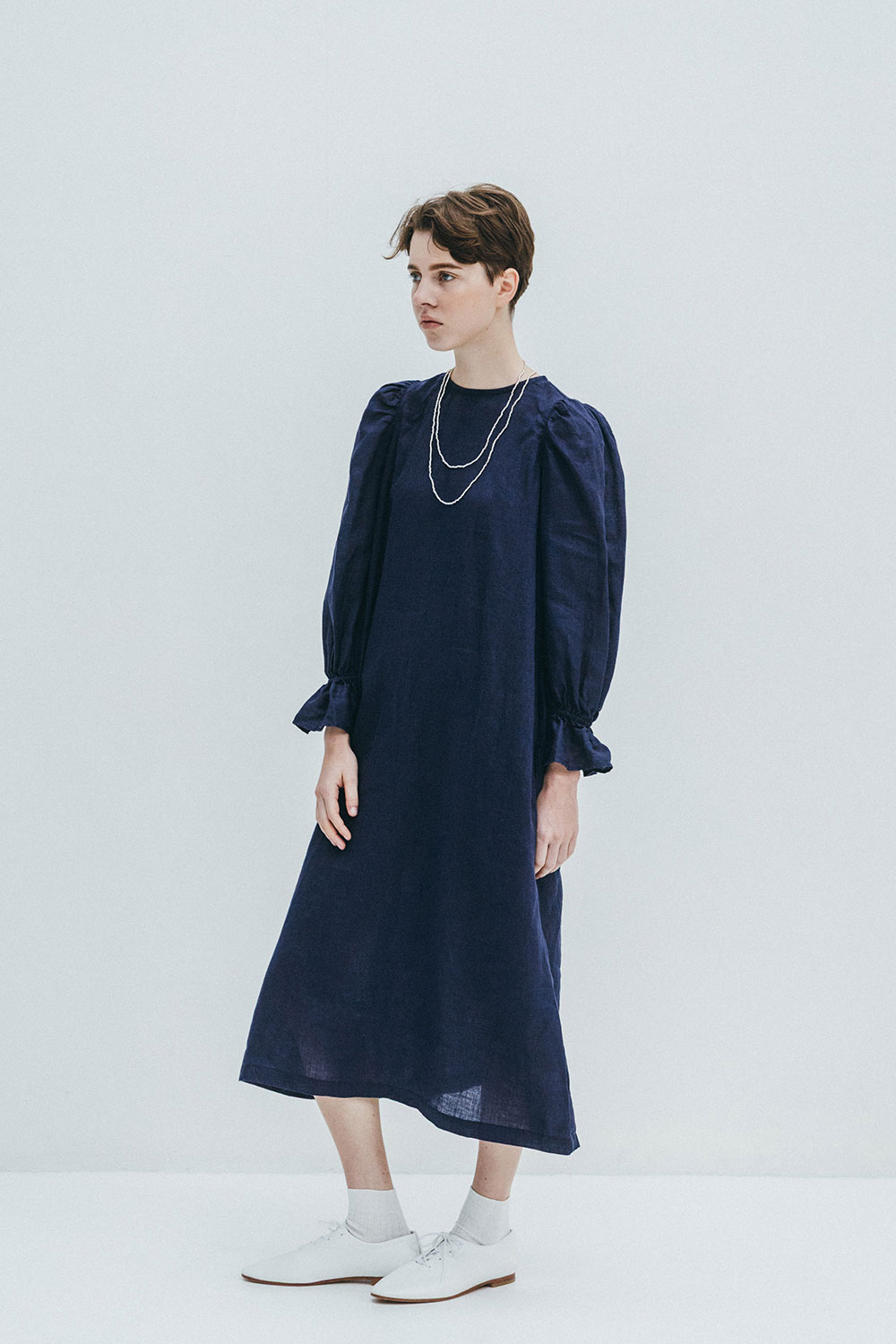 身頃は広がりをおさえたすとんと落ちるシルエットで、甘さ控えめの大人の印象に。
