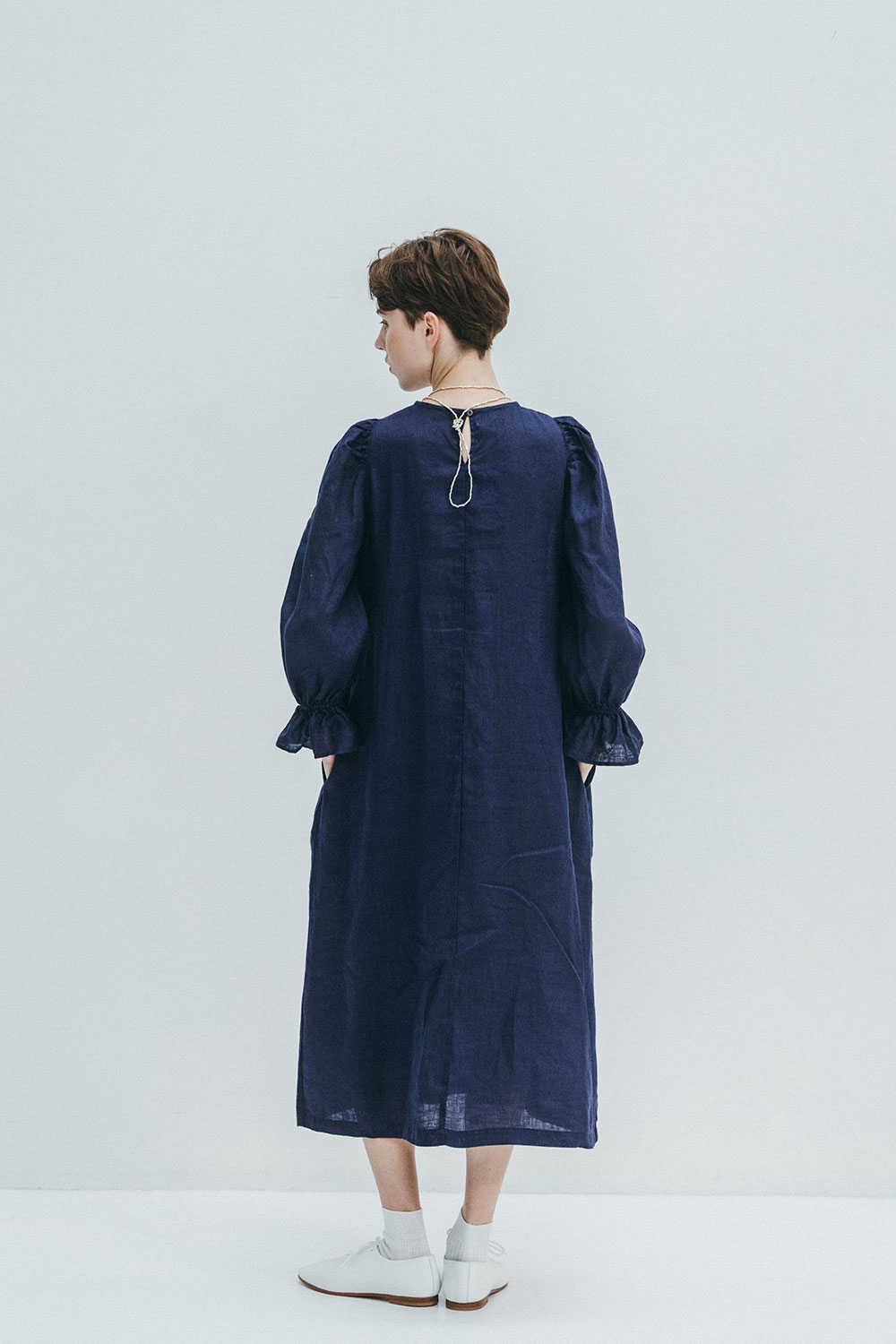 後ろ襟ぐりにはティアドロップあきを施し、後ろ姿にもさりげないポイントを。