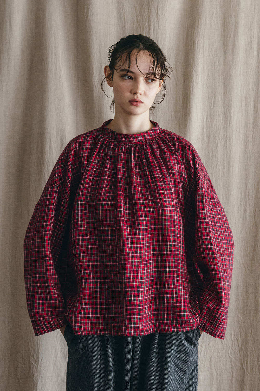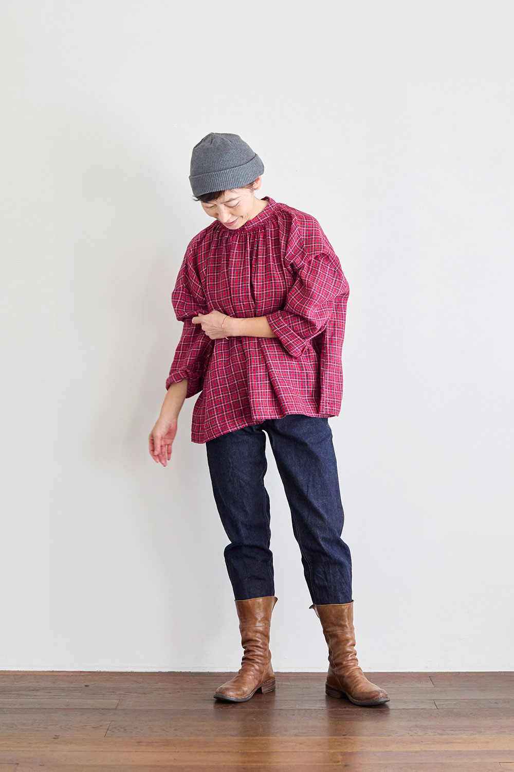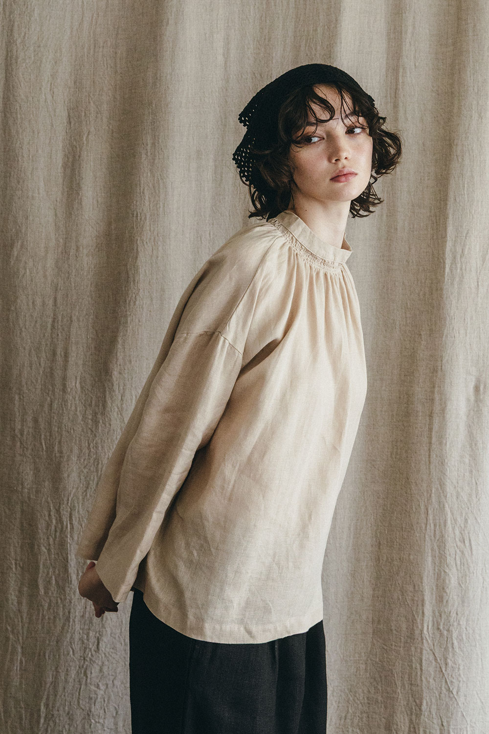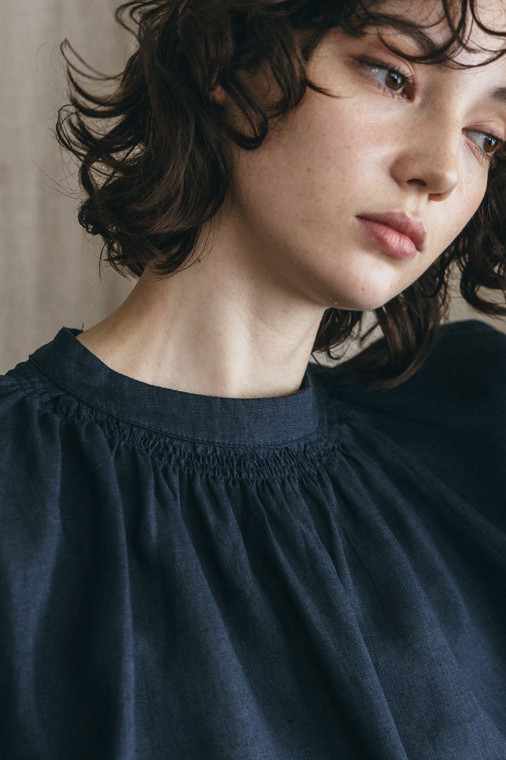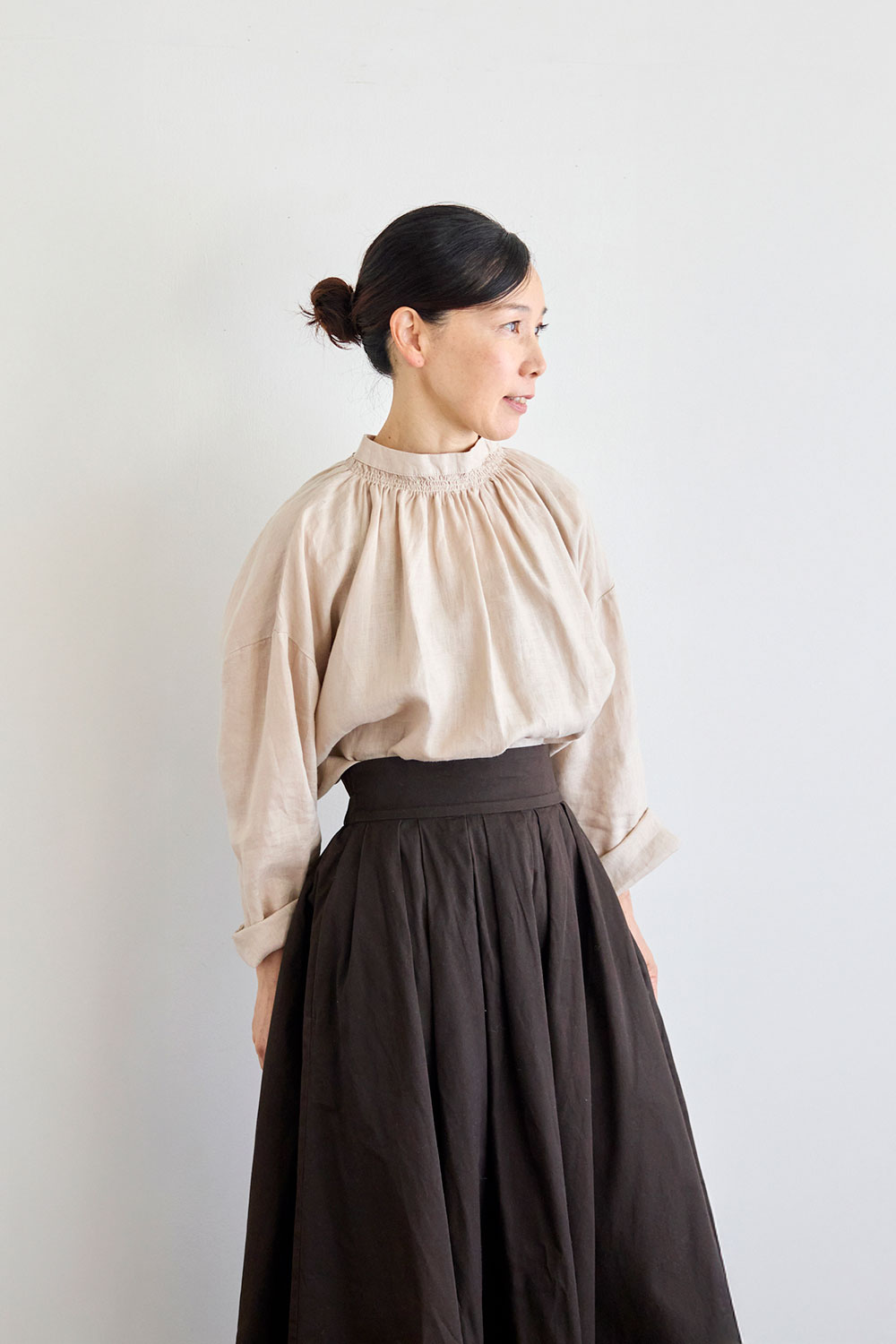 襟元にはたっぷりとギャザーを寄せ、シンプルなかたちの中にさりげない華やかさを添えました。