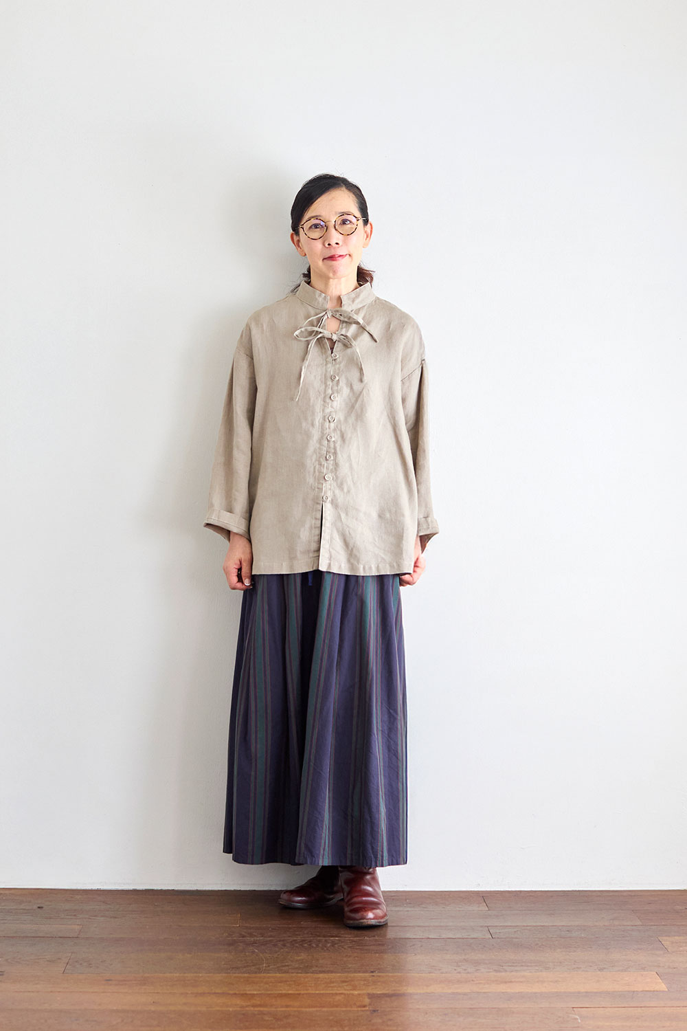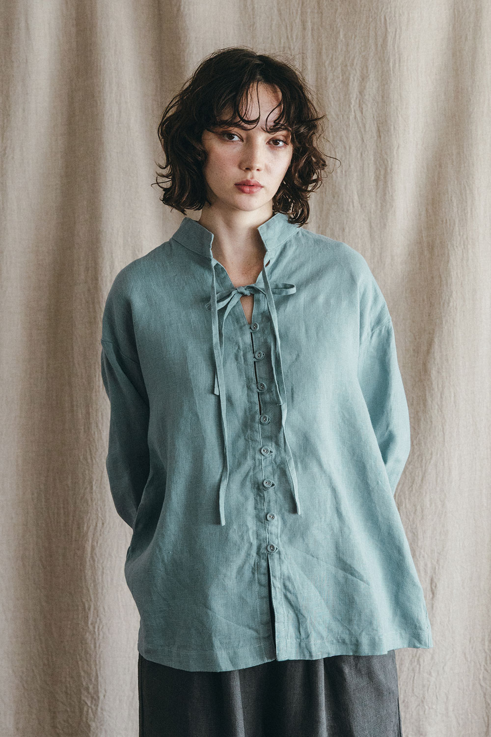 バンドカラーのブラウスは、深めに開いた首元を2本のリボンで結ぶデザイン。