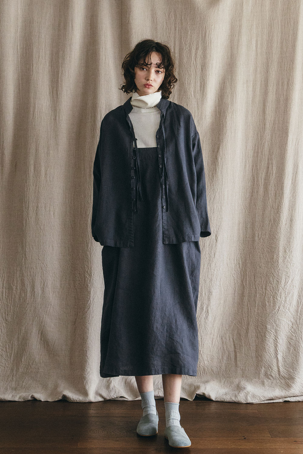 首もとのリボンとくるみボタンが、やわらかな女性らしいニュアンスを添えてくれます。