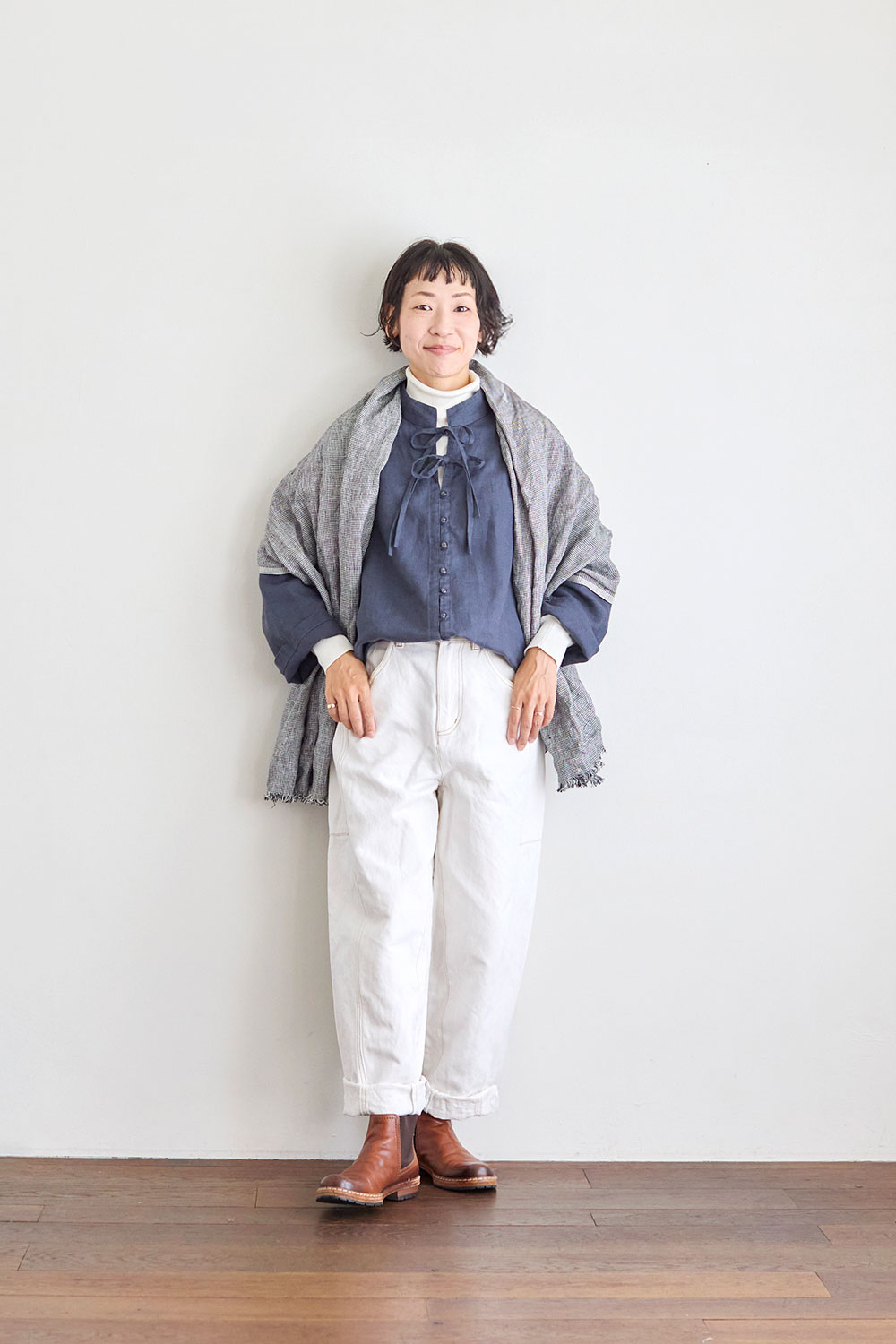 身長153㎝ 「羽織としても活躍するブラウスは、夏以外の3シーズンで活躍しそう!ゆったりとしたサイズ感なので、インナーにハイネックのニットを合わせても大丈夫です。リボンをどちらも結んで、ブラウスが主役のコーデにするのもおすすめ」