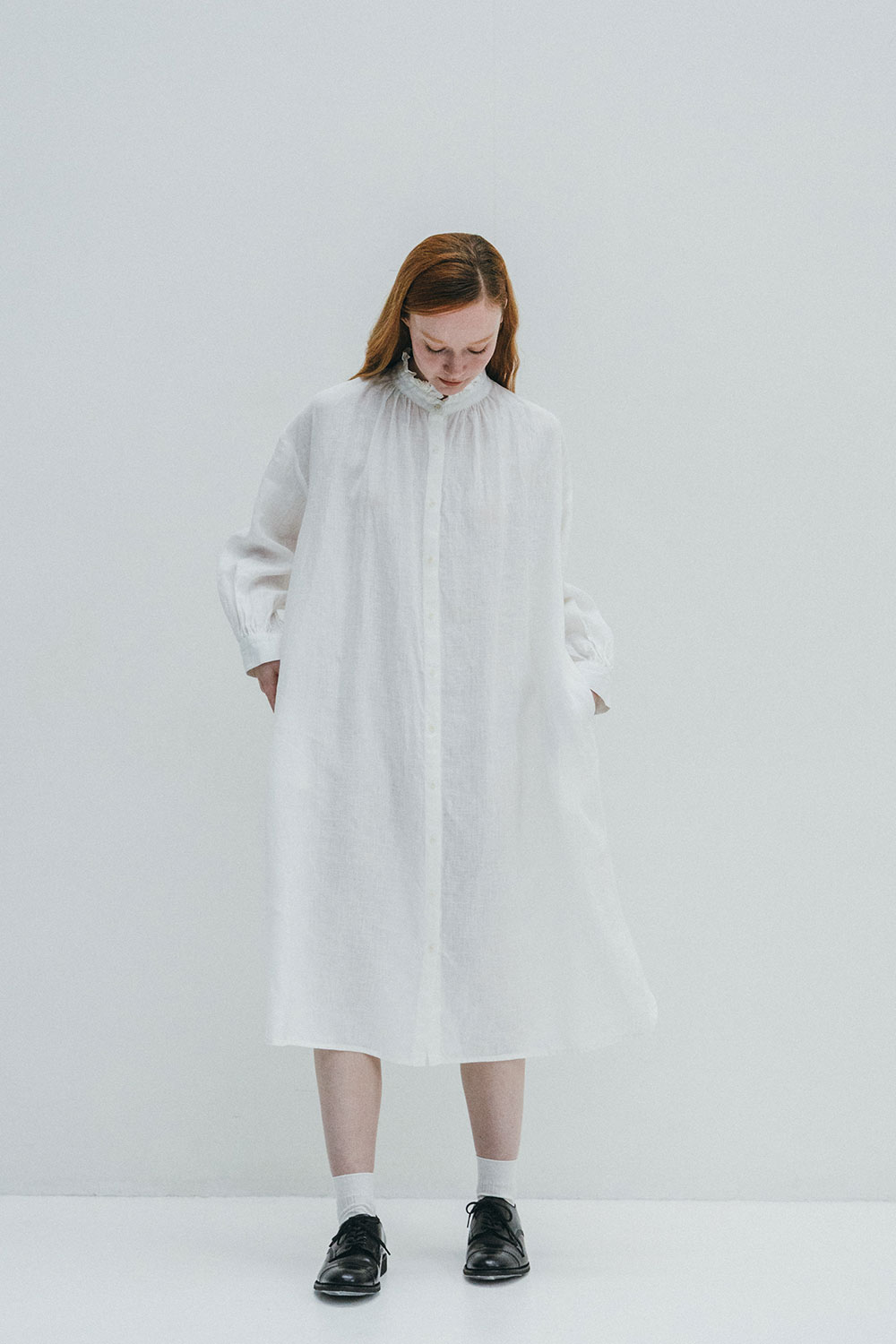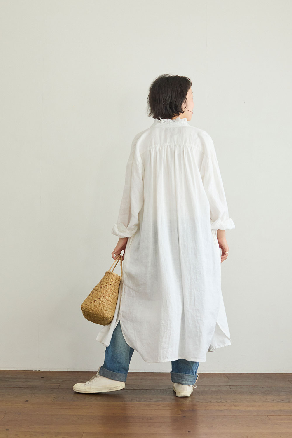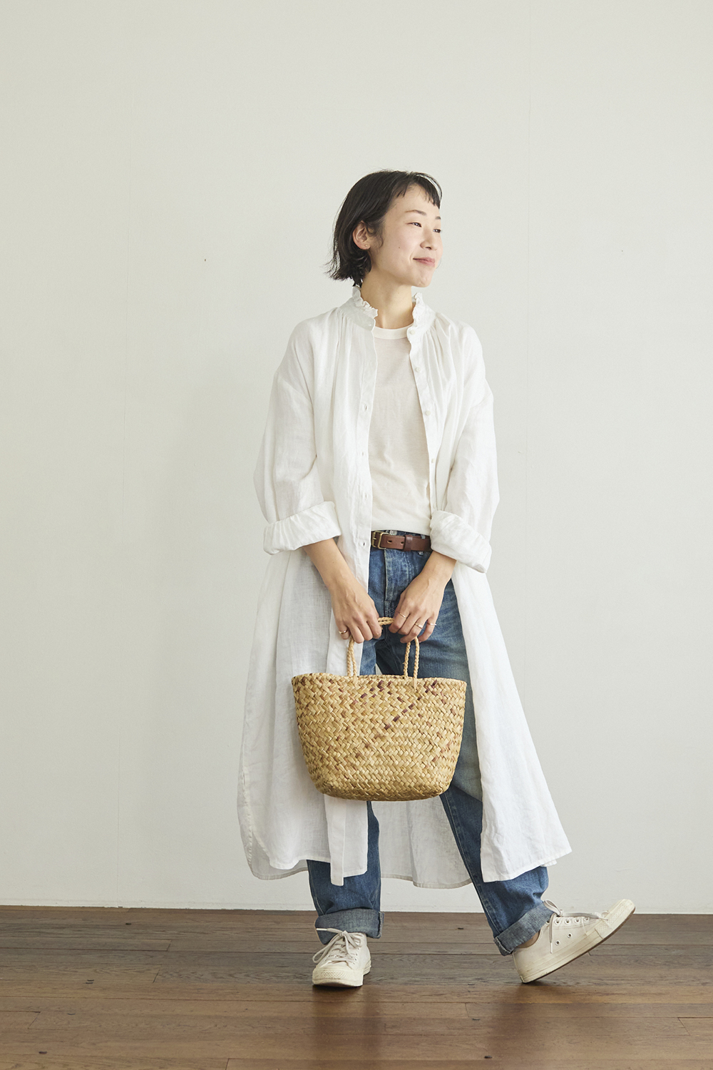 身長153㎝ 「白×フリルがかわいい前あきワンピースは、甘さのあるデザインなのでデニムを合わせて少しカジュアルダウン。前を開けて羽織として使えば、コーディネートの幅もぐっと広がります。もちろんボタンを留めてワンピースとして着ても。私が着ると長めの着丈ですが、サイドがラウンドしたラインになっているので重たくならず、軽やかな印象で着られました」