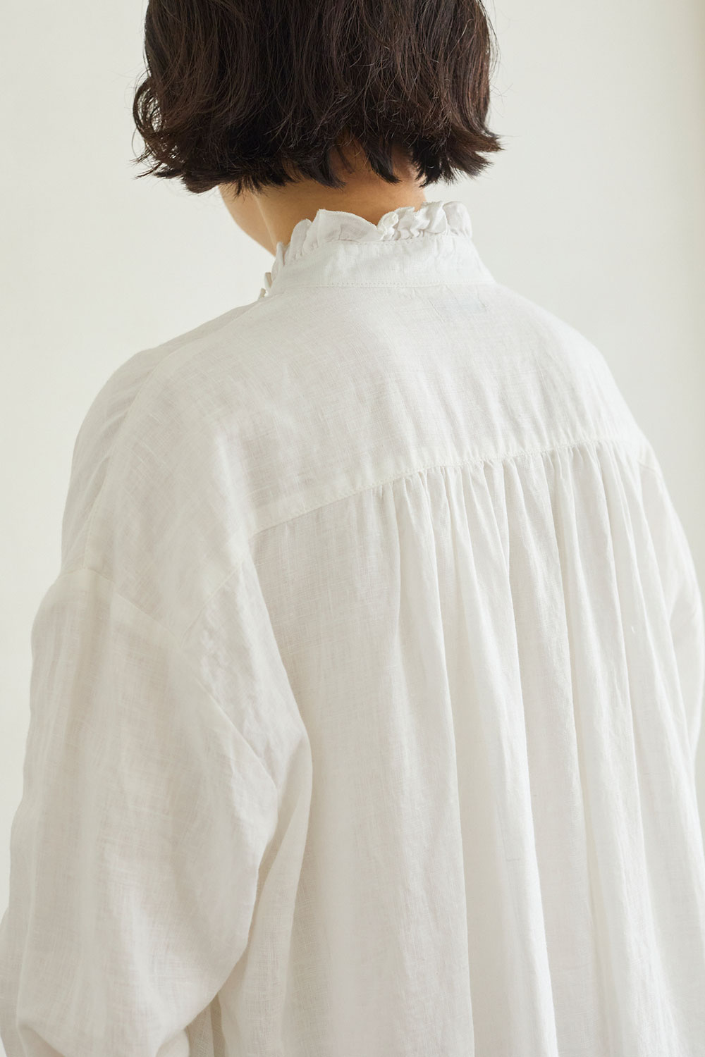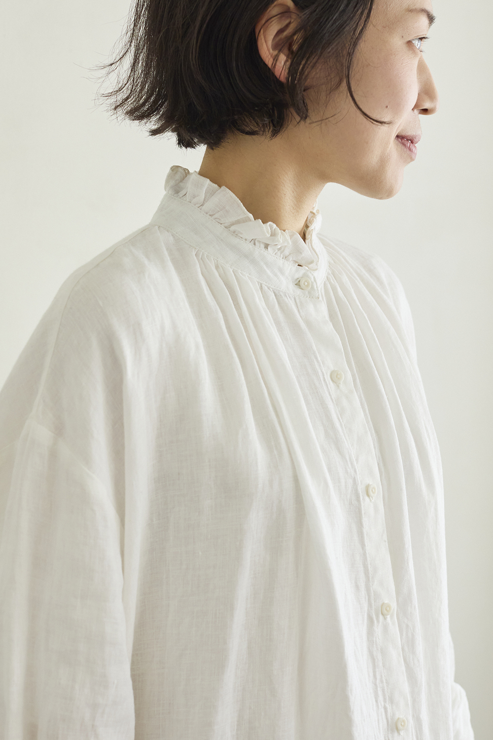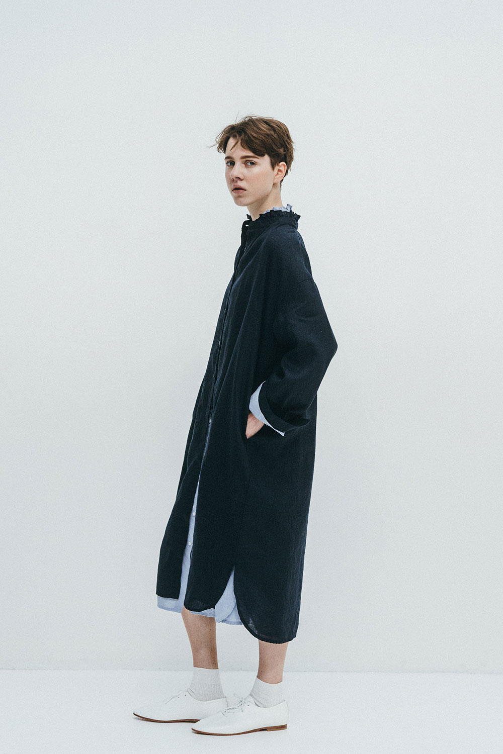 <羽織りとしても楽しめる、フリル襟のシャツワンピース>襟元のフリルが印象的なシャツワンピース。