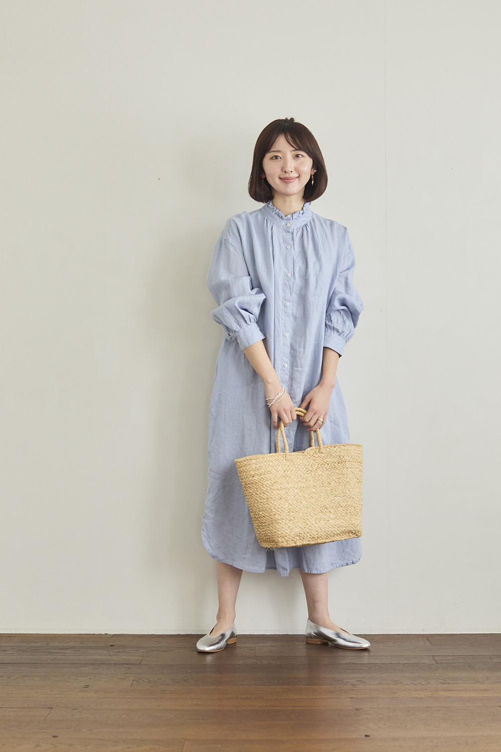 右:身長161㎝ 「春らしい淡い水色のワンピースを主役にコーディネートしてみました。襟元のフリルと太めのカフスがクラシカルな印象で気に入っています。今回はかごバッグとフラットシューズのパンプスですこしカジュアルにしてみましたが、ヒールと合わせておめかししてもよさそうです」