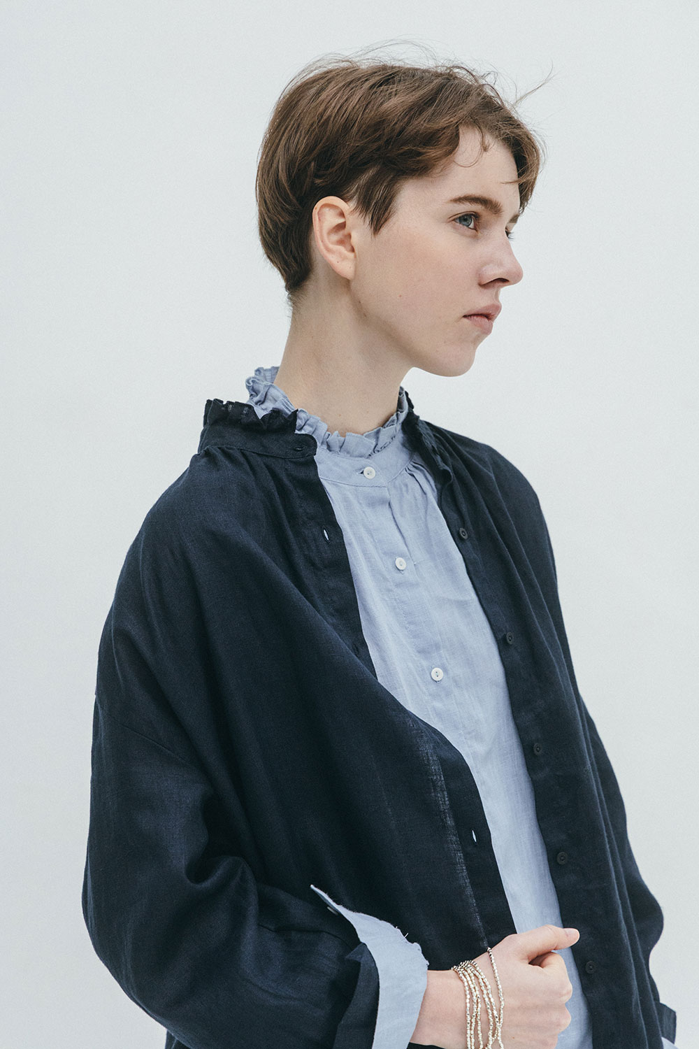 前を開けてTシャツやパンツの上からさらりと羽織ってカジュアルにコーディネートしたり、上にニットやベストをレイヤードしても。
