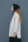 詰まった襟ぐりとカフスがクラシカルな雰囲気ながら、ドロップショルダーとラウンドしたヘムラインでほどよく抜け感があり、シンプルなパンツにあわせるだけでコーディネートがきまります。