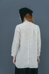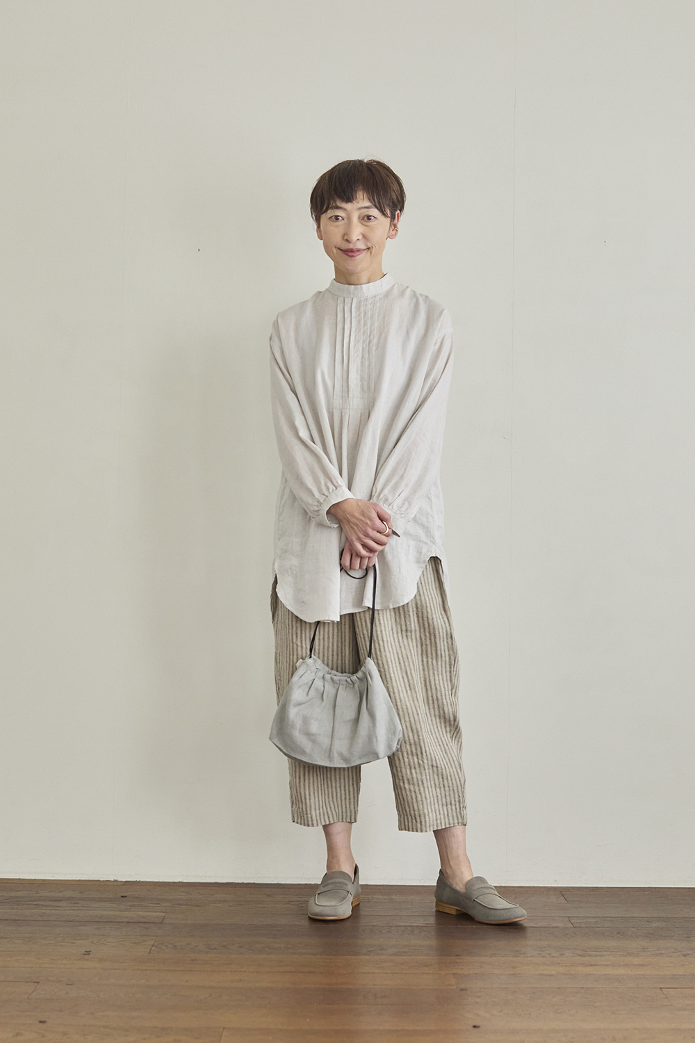 身長160㎝ 「丈が長くておしりがすっぽりと隠れるところが、1枚で着られていいですね。サイドがラウンドヘムになっているから、アウトして着ても軽やかです。詰まった襟元と、タックが上品な印象なところも気に入っています。今回は