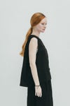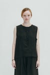 <重ねるだけでこなれる、軽やかな前あきベスト>前開きのリネンベスト。着丈に前後差をつけ、サイドにスリットを入れて軽やかに仕立てました。