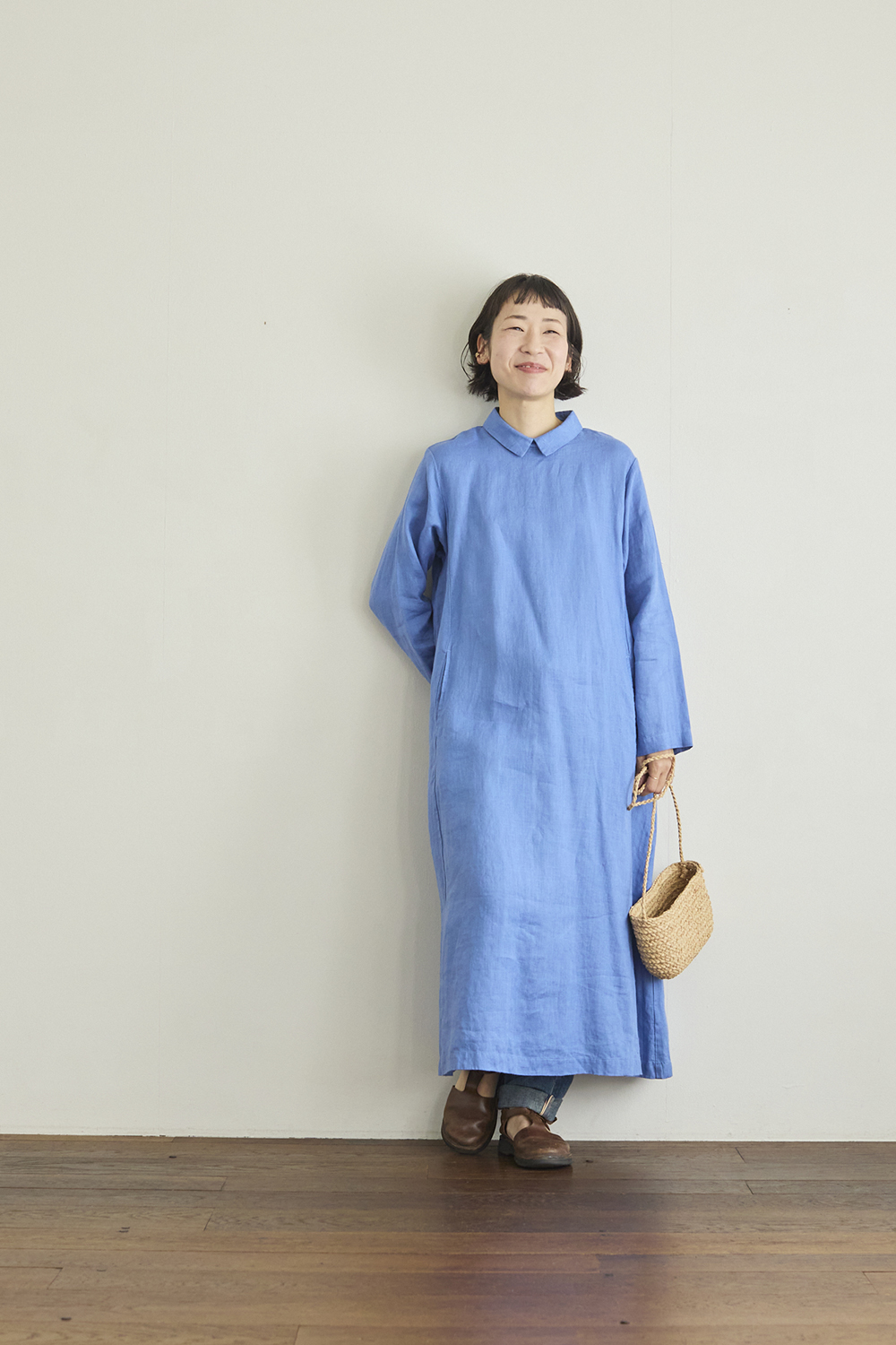 身長153㎝ 「可愛らしい印象のワンピースなので、今回はデニムとレザーシューズを合わせて、少しカジュアルダウンしたコーディネートにしてみました。私が着るとたっぷりとした着丈なので、一枚でさらっと着るだけでも様になり、きれいめなスタイリングにするのもいいと思います。春らしいブルーがぱっと顔色を明るく見せてくれます。」