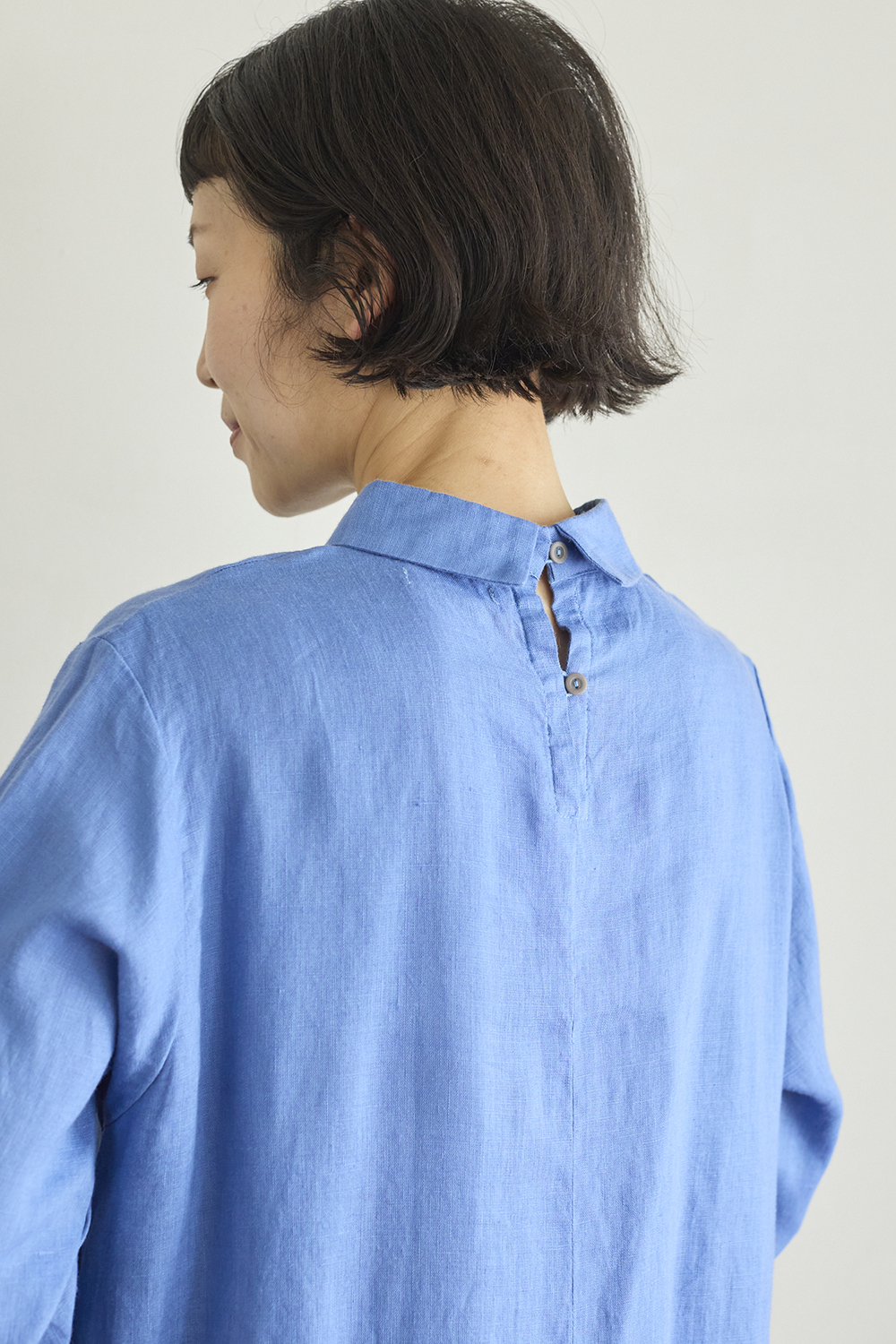 後ろ襟ぐりには小さなティアドロップあきを施し、後ろ姿にもさりげないアクセントを。