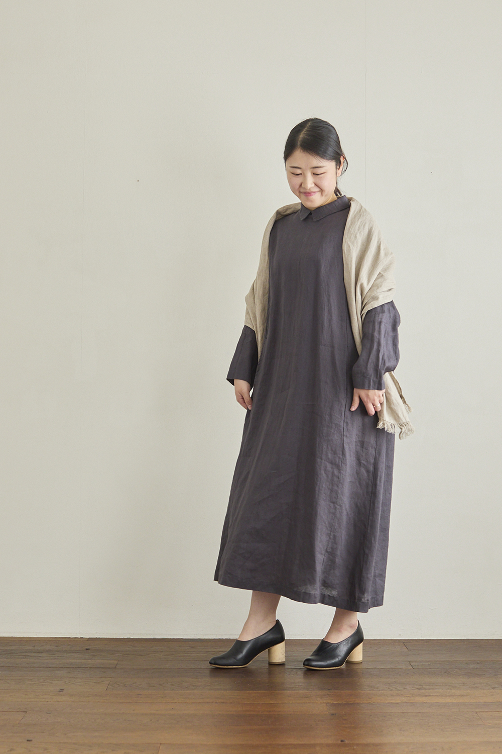 右:身長154㎝ 「クラシックな襟付きワンピースにヒールとストールを合わせて、少しおめかししたコーディネートにしてみました。トワイライトは黒でもグレーでもない、奥行きのあるニュアンスカラーで、さっと着るだけでもおしゃれな雰囲気が出るところがお気に入りです」