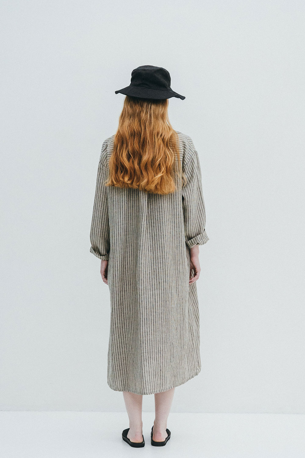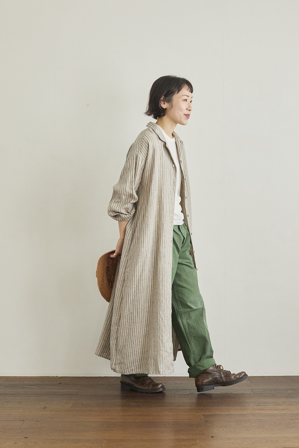 身長153㎝ 「わたしが着るとしっかりとした着丈がありますが、新色のストライプ生地が縦のラインを強調してくれるので、重たく見えず、すっきりとした印象で着られます。前を開けて羽織として着るときは、袖をまくるとぐっとこなれた雰囲気に。」