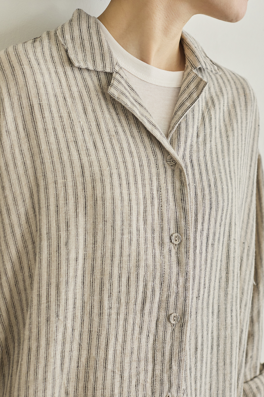 <ワンピースとしても楽しめる、春の空気をまとったオープンカラーのコート>たっぷりとした身幅とドロップショルダーで、リラックス感のある着心地です。