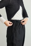 左:身長153㎝ 「ヒップ周りにゆとりがあって、体のラインを拾わないらくちんな履き心地がお気に入り。ウエストにトップスをインして、サイドのリボンを見せるとかわいいですね。ウエストはゴムと紐の仕様でバランスがとれるので、裾はわたしの身長でもロールアップせずに履けました。」