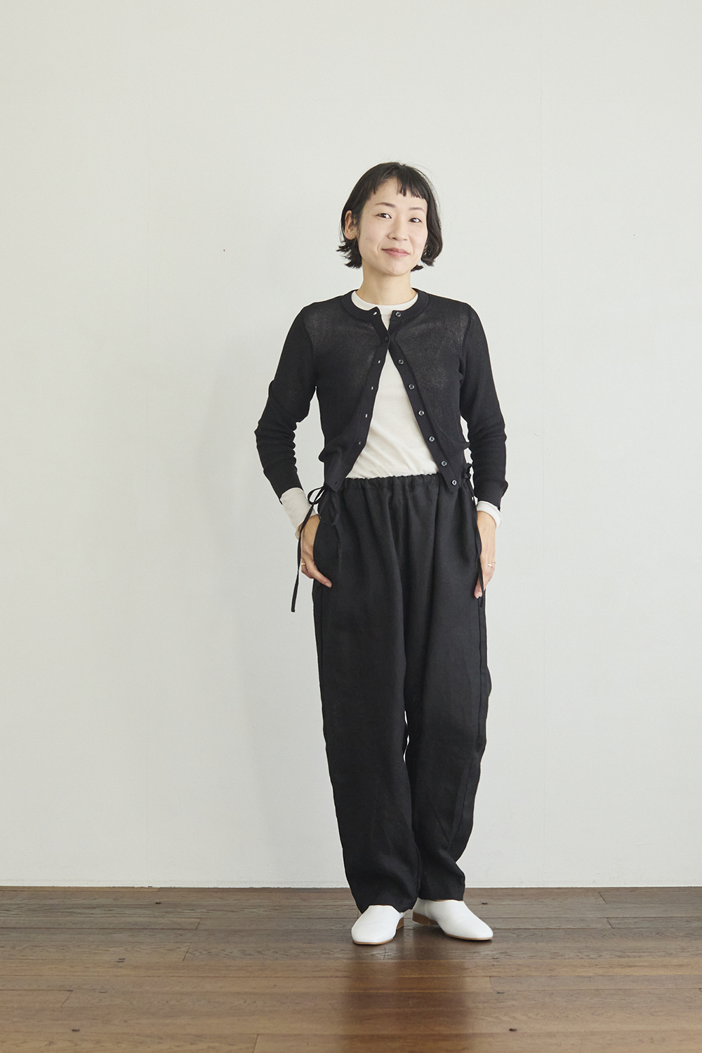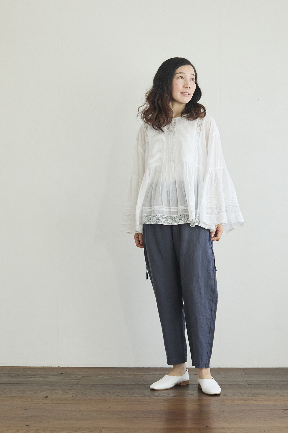 右:身長161㎝ 「サイドのリボンを垂らしてアクセントに。リラックスした履き心地ですが、裾に向かってすぼまったすっきりとしたシルエットなので、ふんわりとした甘めのレースのトップスを合わせて、女性らしさをプラスしました。シンプルなのでどんなトップスとも合わせやすそうです」