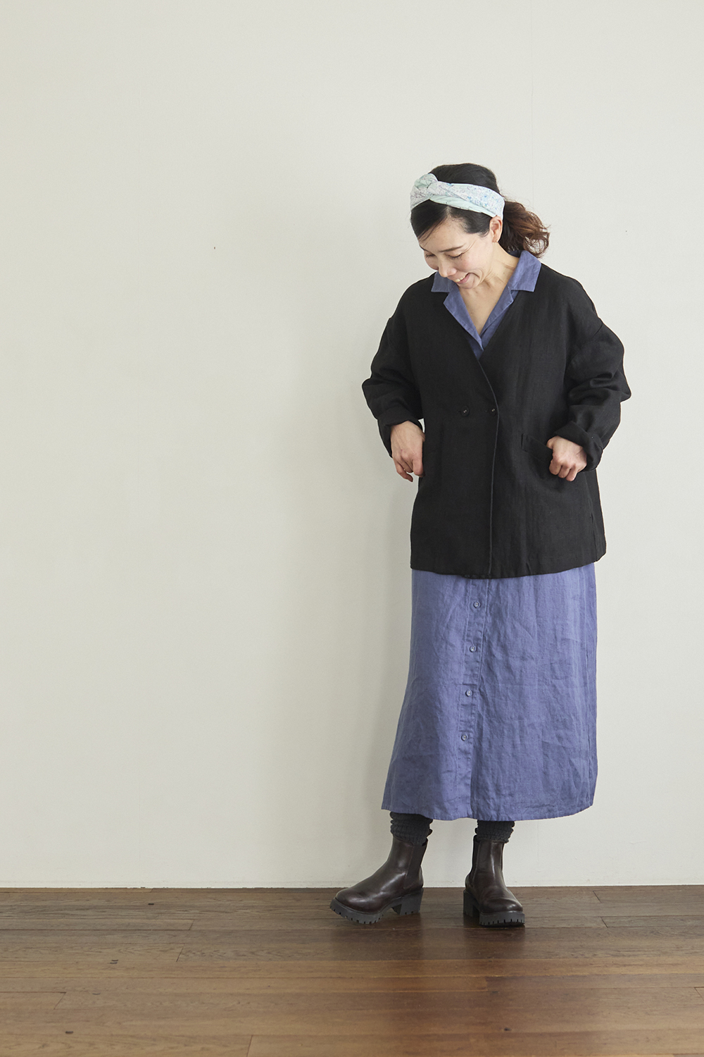 クララ サロペットを合わせて、カジュアルにコーディネートしてみました。ジャケットですが、ドロップショルダーでゆったりとした着心地なので、かしこまりすぎずデイリーにも取り入れやすい一枚。バックにはベンツ入りで動きやすく、またリネン素材でお洗濯ができるので、アクティブなシーンでも気負わず着られるのが嬉しいポイントです。」