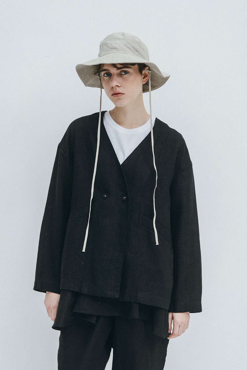 <リラックス感と品のよさを併せ持つ、ノーカラーのダブルジャケット>厚地のリネン生地で仕立てた、ノーカラーのダブルジャケット。