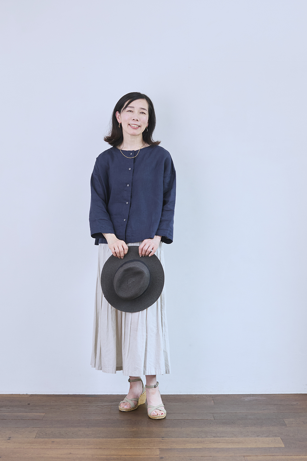 左:身長161㎝「ホワイトのシンプルなリネントップスは、Tシャツのような気軽さで着られて、でもカジュアルすぎないバランスになるので、重宝しそうです。夏は意外と冷房の効いた室内などで肌寒いことが多いので、羽織りとしても着られる薄手の長袖が役立ちます」