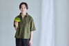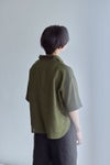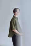 左:身長161㎝「暗すぎないカーキは春の装いにぴったりな色味。首元のボタンは開けるとラフに、しめるときちんとした感じになります。ゆったり身幅と長めの半袖丈がさりげなく体型をカバーしてくれます。」