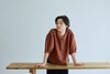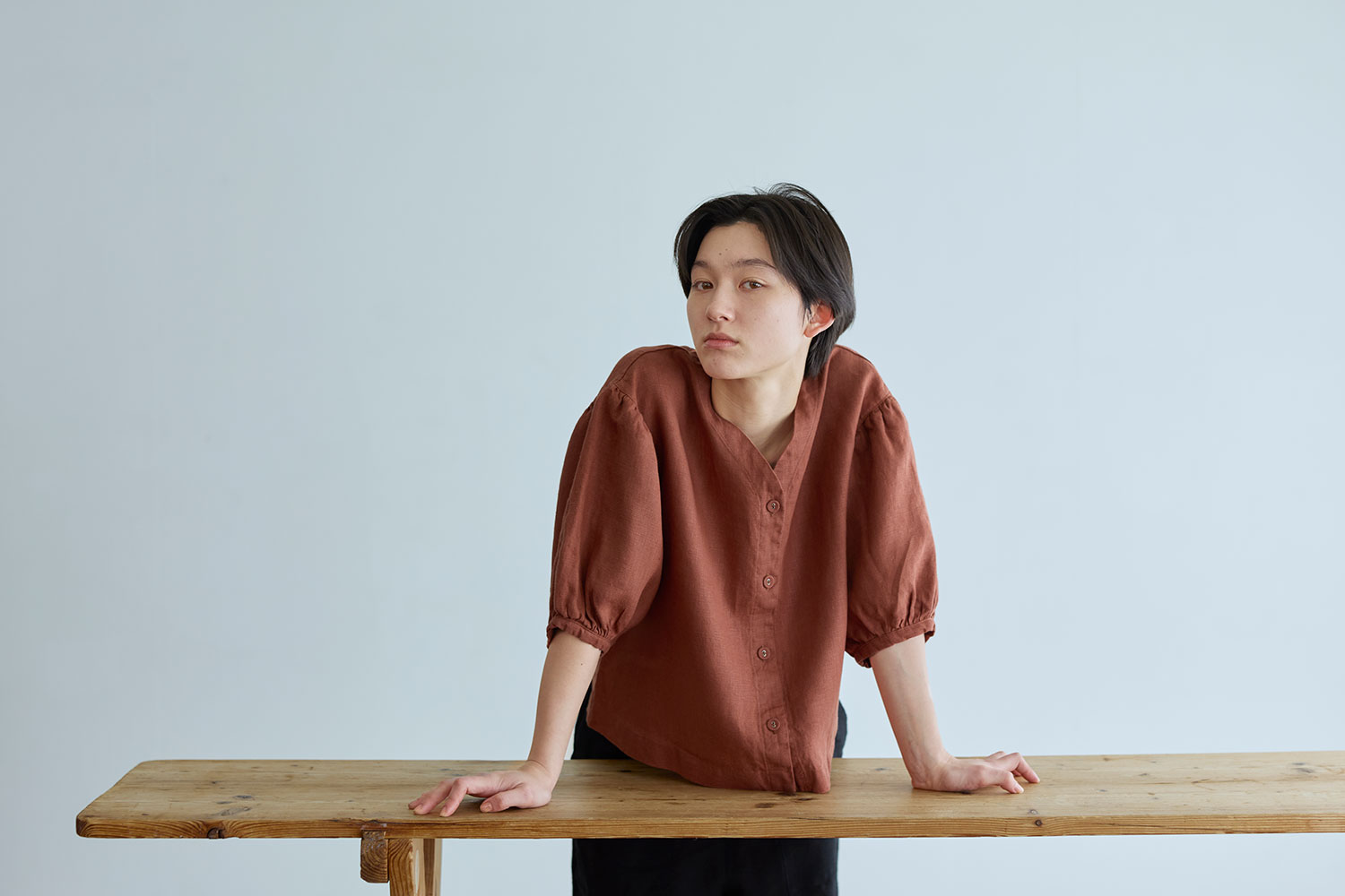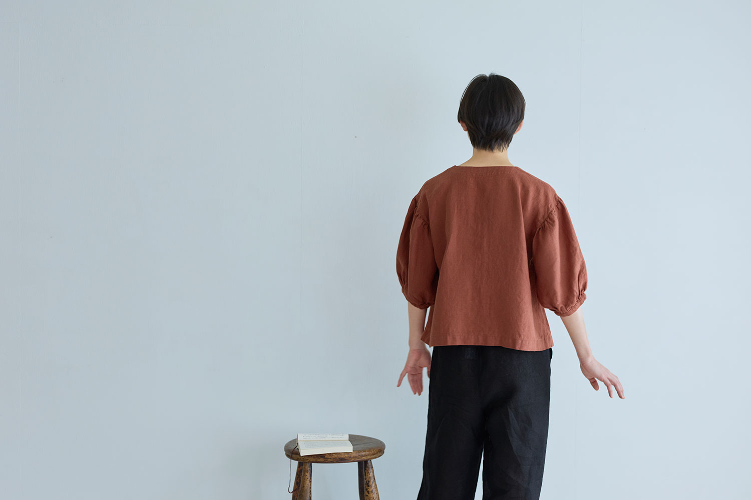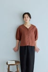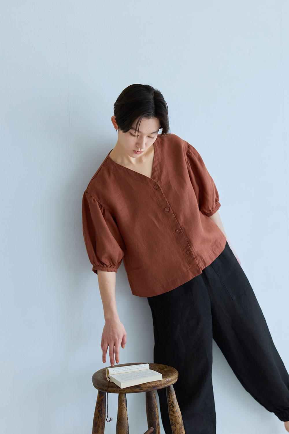 前開き仕様のブラウスは、ゆるやかな V ネックラインと、ドロップショルダーから続くボリュームのある袖が印象的な一着。