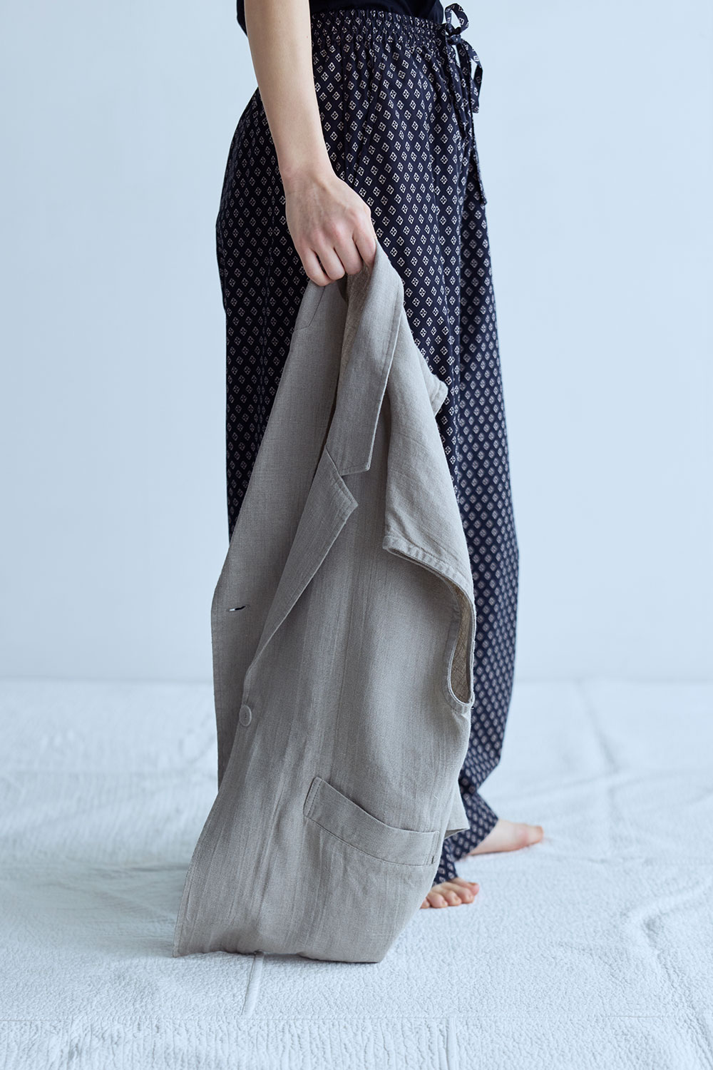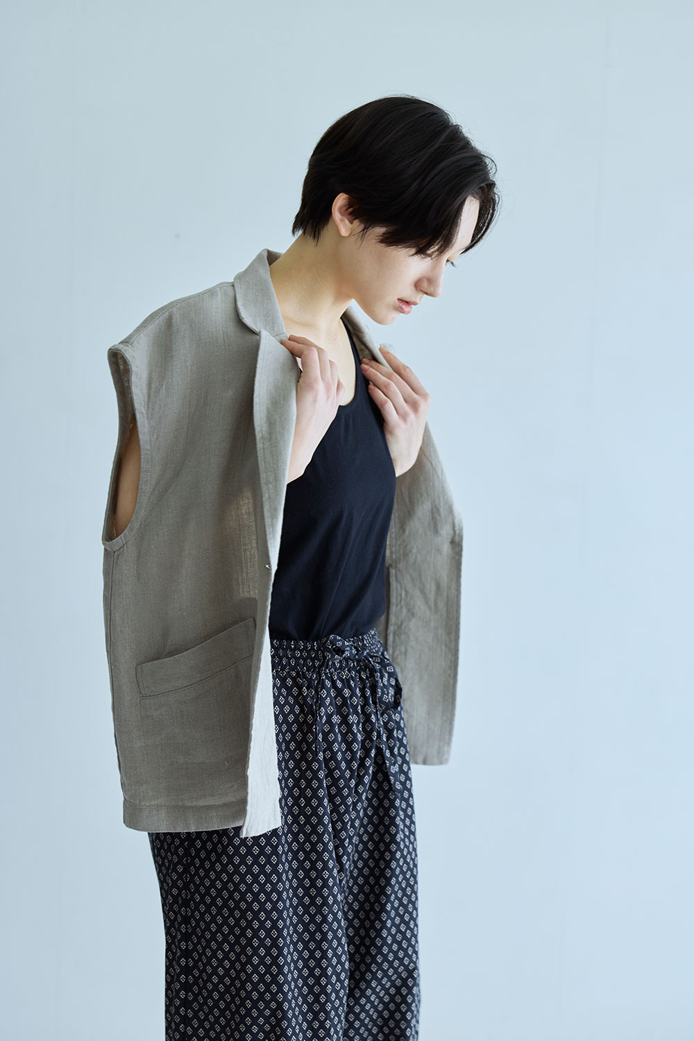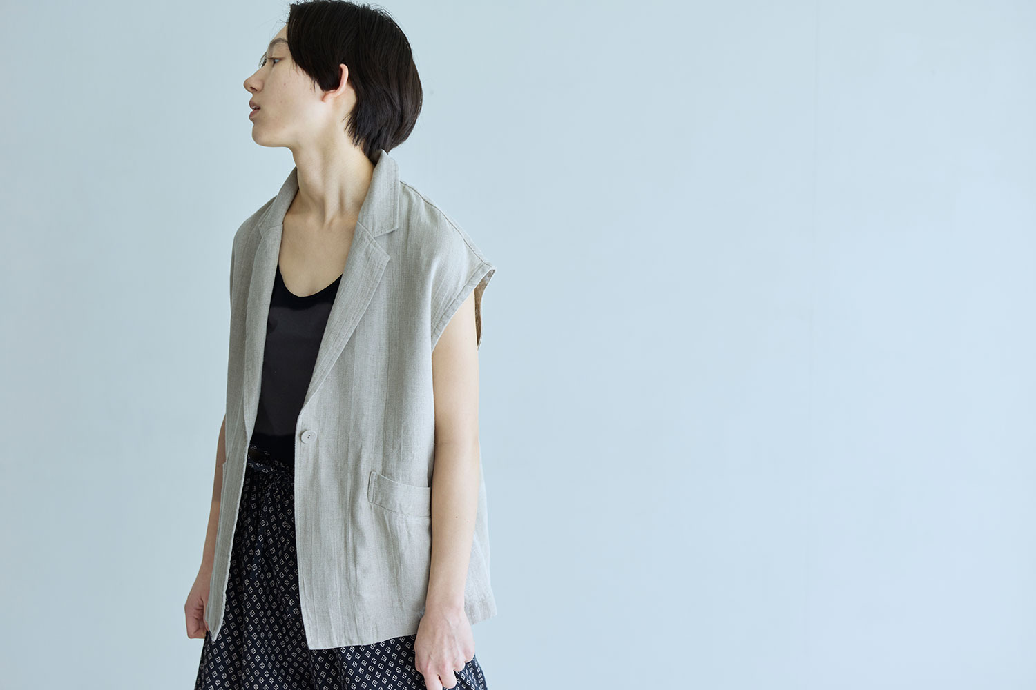 程よい厚みの普通地リネン生地で仕立てた、テーラードカラーのベスト。