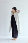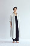 左:身長153㎝「羽織としてもワンピースとしても着られるので、1枚あるとコーディネートの幅がぐっと広がる便利なアイテムです。今回はデニムを合わせて、カジュアルなスタイルに仕上げてみました。襟元をしめてきちんとした感じもいいのですが、開けてインナーの覗かせるとこなれたかんじになります」