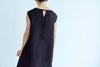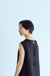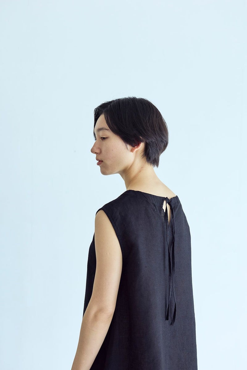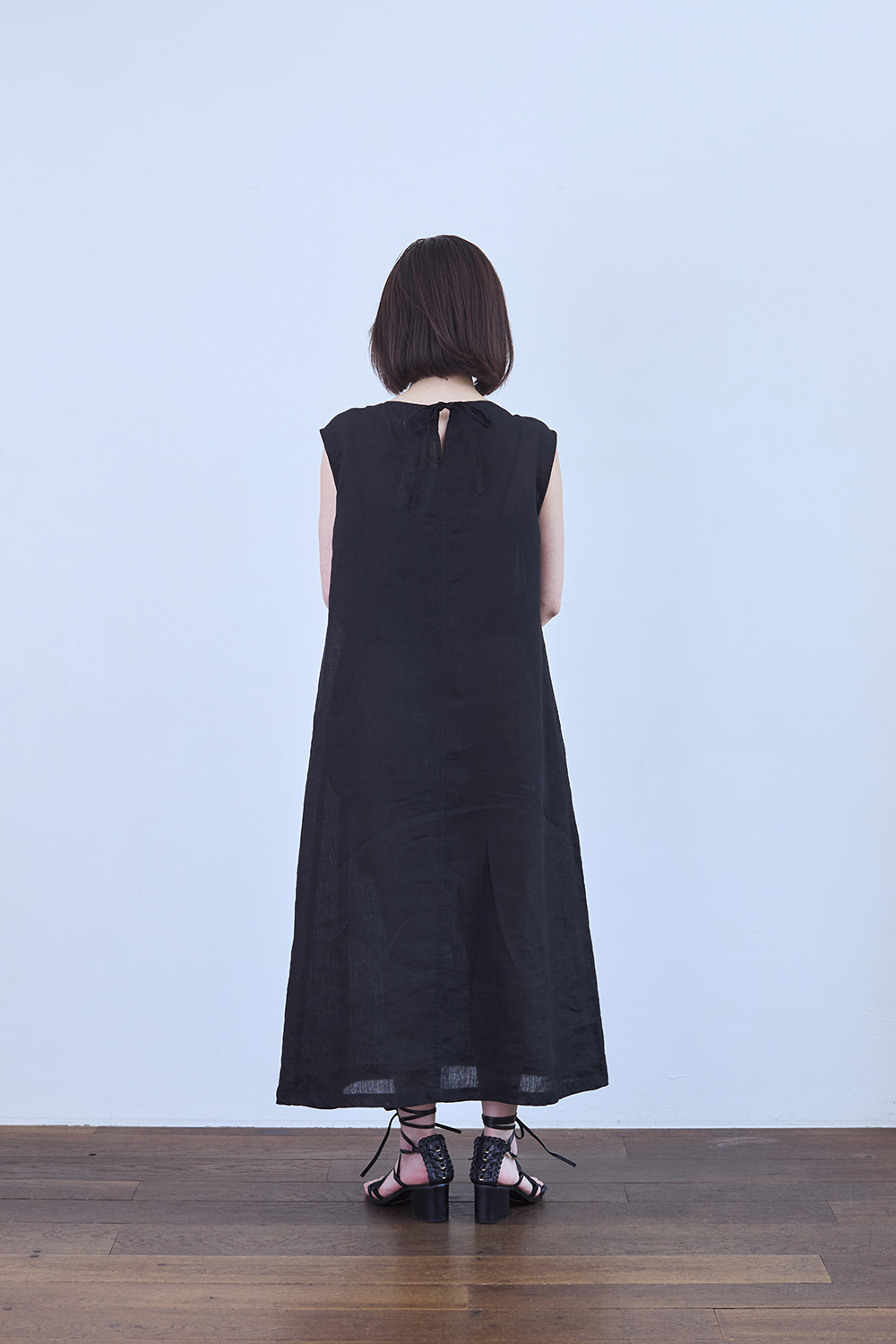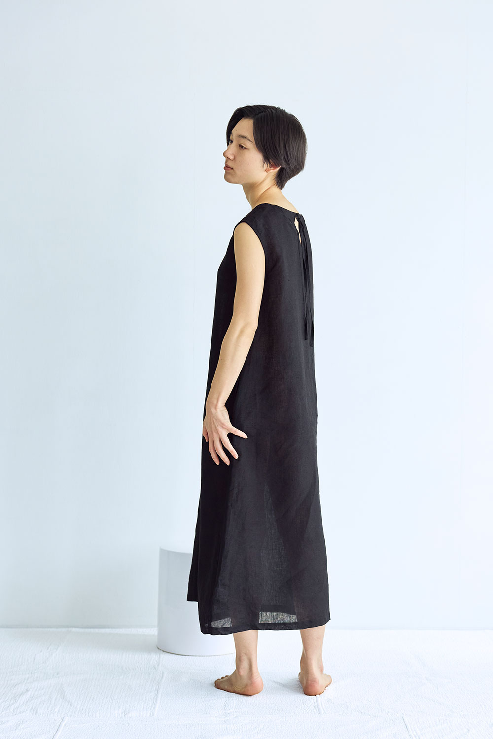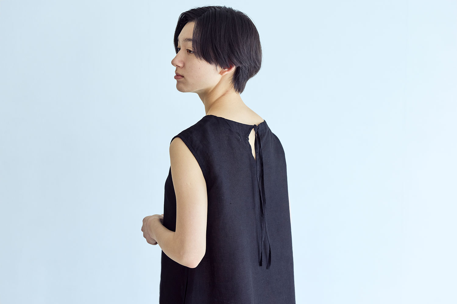 後ろ襟ぐりは細いリボンで結ぶ仕様になっており、後ろ姿にさりげない可愛らしさを添えています。