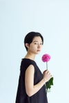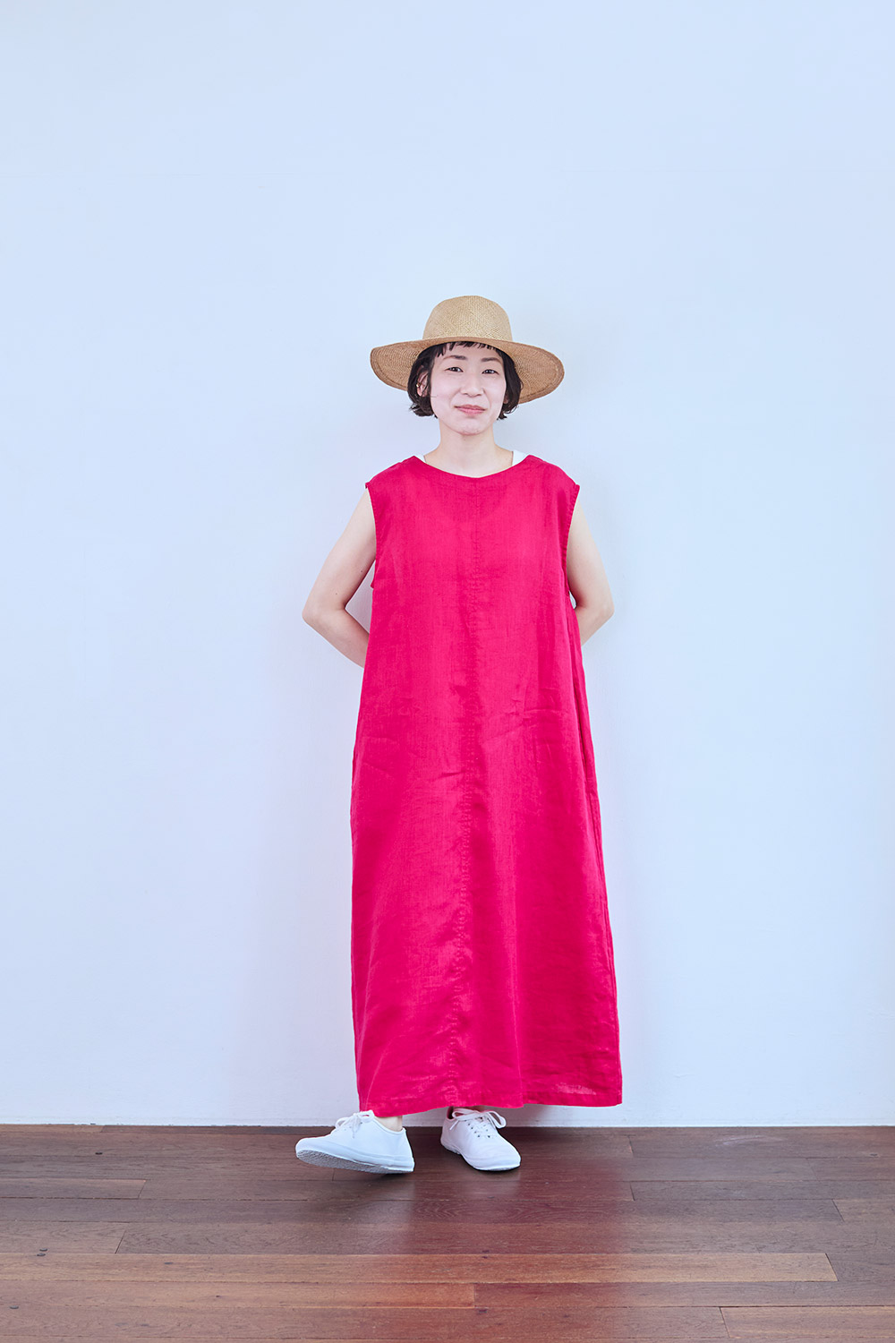 身長153㎝「ビビットなピンクレッドが、夏の日差しにぴったりでとってもかわいいです。インナーにタンクトップを覗かせるとカジュアルな雰囲気になります。わたしの身長で着ると、フルレングス。スニーカーやペタンコなサンダルとも合わせられる丈感です