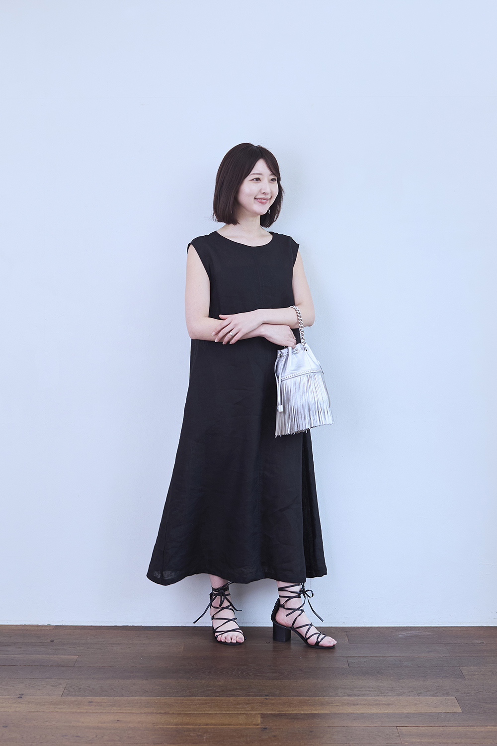 身長161㎝「ブラックは合わせる小物次第で、おめかしコーディネートに。ディナーやお呼ばれにも着ていけそうです。