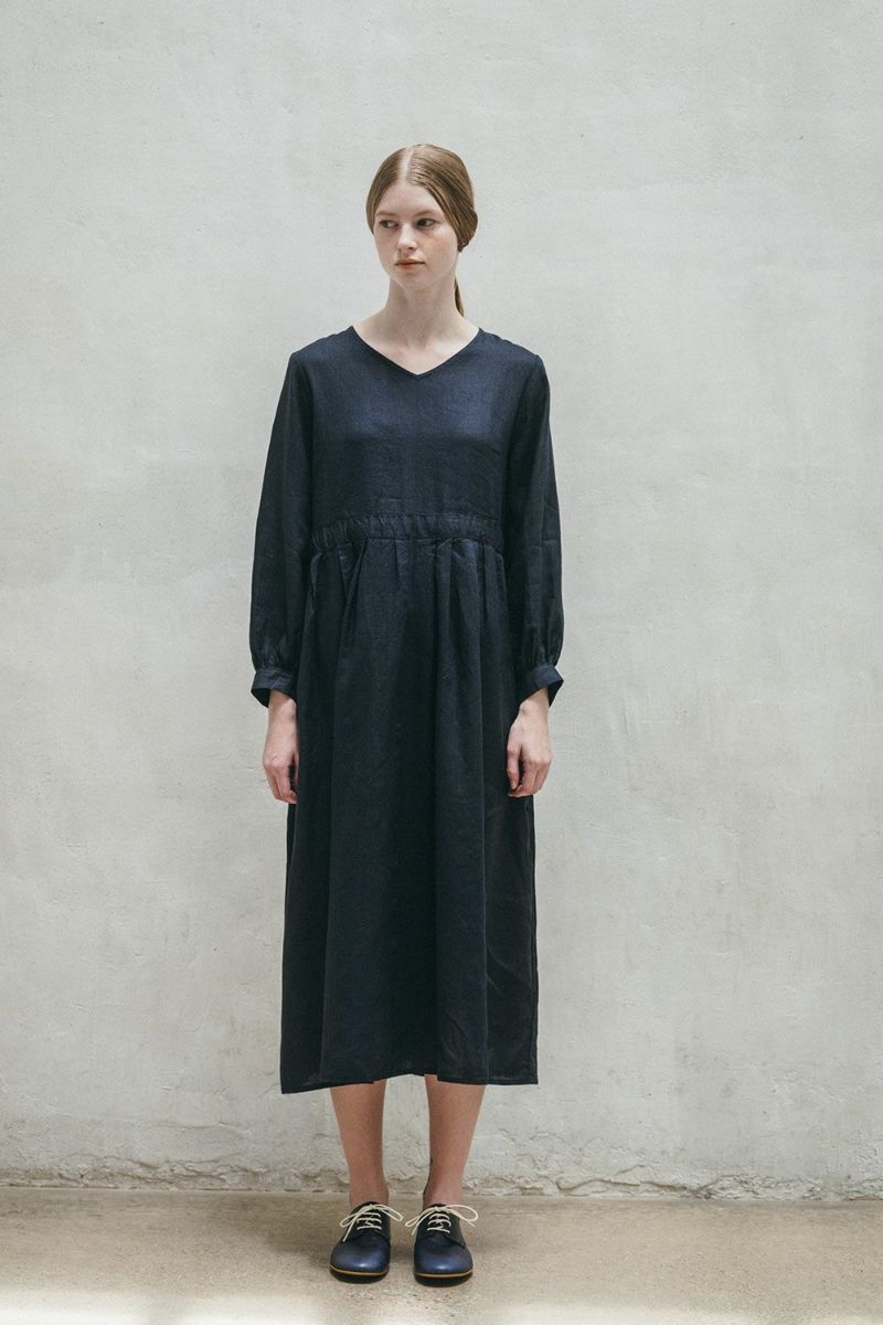 ほどよく開いたVネックラインのワンピースは、上身頃はすっきり、スカート部分はウエストに取られたタックと、自然にギャザーが広がるバランスで、女性らしい印象に仕上げました。