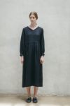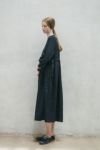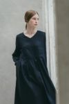 「こういうのが着たかった!の、一枚。生地を贅沢にたっぷりと使って、袖口のギャザーもふんわりとして、とてもfogらしいワンピースだと思います。ウエストの紐を伸ばしてAラインにすれば可愛らしく、キュッと絞ればほっそり見えて、印象が変わります。Vネックのおかげで甘すぎないのがとてもいいです」