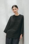 「身幅、袖幅がたっぷりしていますが、私が着ると手首が出るので軽やかな印象。Tシャツ感覚で楽に着られますが、薄手のリネンなのできちんと感も。腰回りがしっかり隠れる着丈なので、タイトなボトムスに合わせても安心です。薄手なのでウエストにタックインしても窮屈にならず、すっきりまとめられます。 」