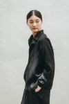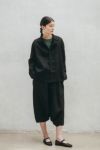 「肩幅広め、腕長めな私が着ると、肩幅はちょうどよく、袖丈は手首が少し見えるくらい。しっかりした生地感なので、ボタンを開けて羽織りとしても合わせたいと思いました。今回はブラックデニムに合わせましたが、オフホワイトやベージュのチノパンと合わせて明るい色味のコーディネートにしたり、フルレングスのワンピースに合わせても羽織っても素敵だと思います」