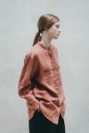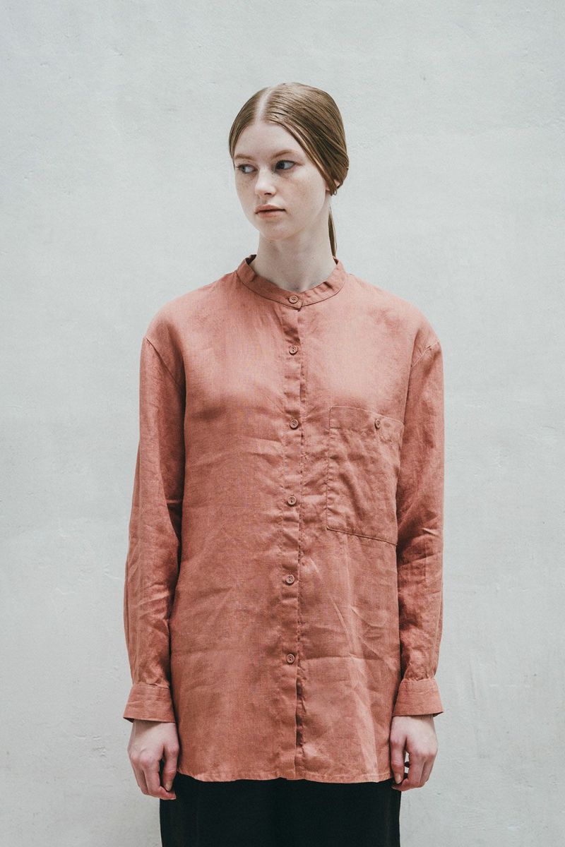 「バンドカラーがきちんと感を出してくれるシャツ。裾を外に出してカジュアルに着るのはもちろん、ウエストにインして、Aラインのスカートやボリュームのあるボトムスなどを合わせてもバランスよく着られそうです」