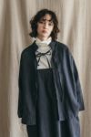 左:身長160㎝ 「首元のリボンが可愛らしくも上品で、気に入っています。リボンを結んでクラシカルに着たり、ラフに垂らして雰囲気を変えたりと、いろいろな着こなしができるのが魅力です。ドロップショルダーで肩まわりが楽なので、きちんとした雰囲気ですが、着用感も快適でした」
