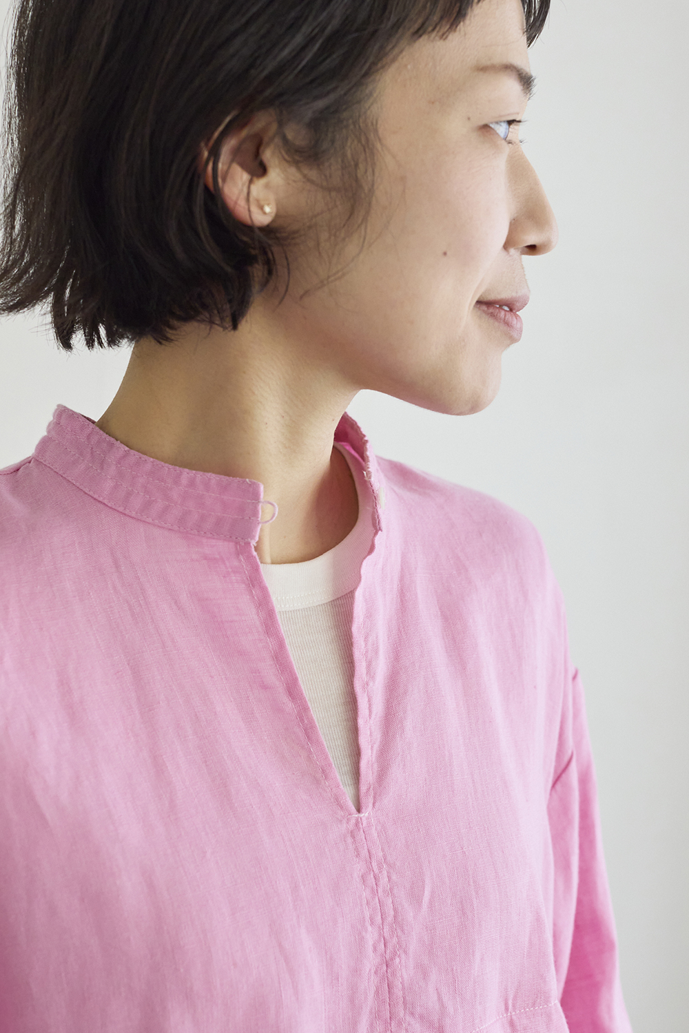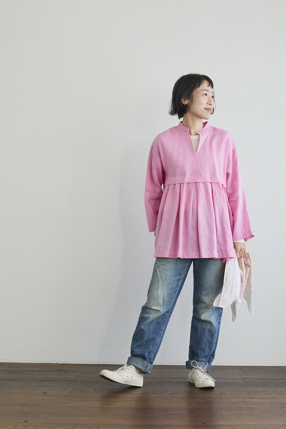 身長153㎝ 「ちょっと難しいかなと思われがちなピンクのブラウスですが、1枚で華やかで、シンプルにデニムを合わせればコーディネートが完成するので、便利なアイテムだと思います。形も高めの位置にウエストの切り替えがあるので、身長が低い方でもバランスよく着ていただけそう。ヒップはぎりぎり隠れるくらいの着丈です。首元のボタンはあけて、インナーを覗かせてみました」