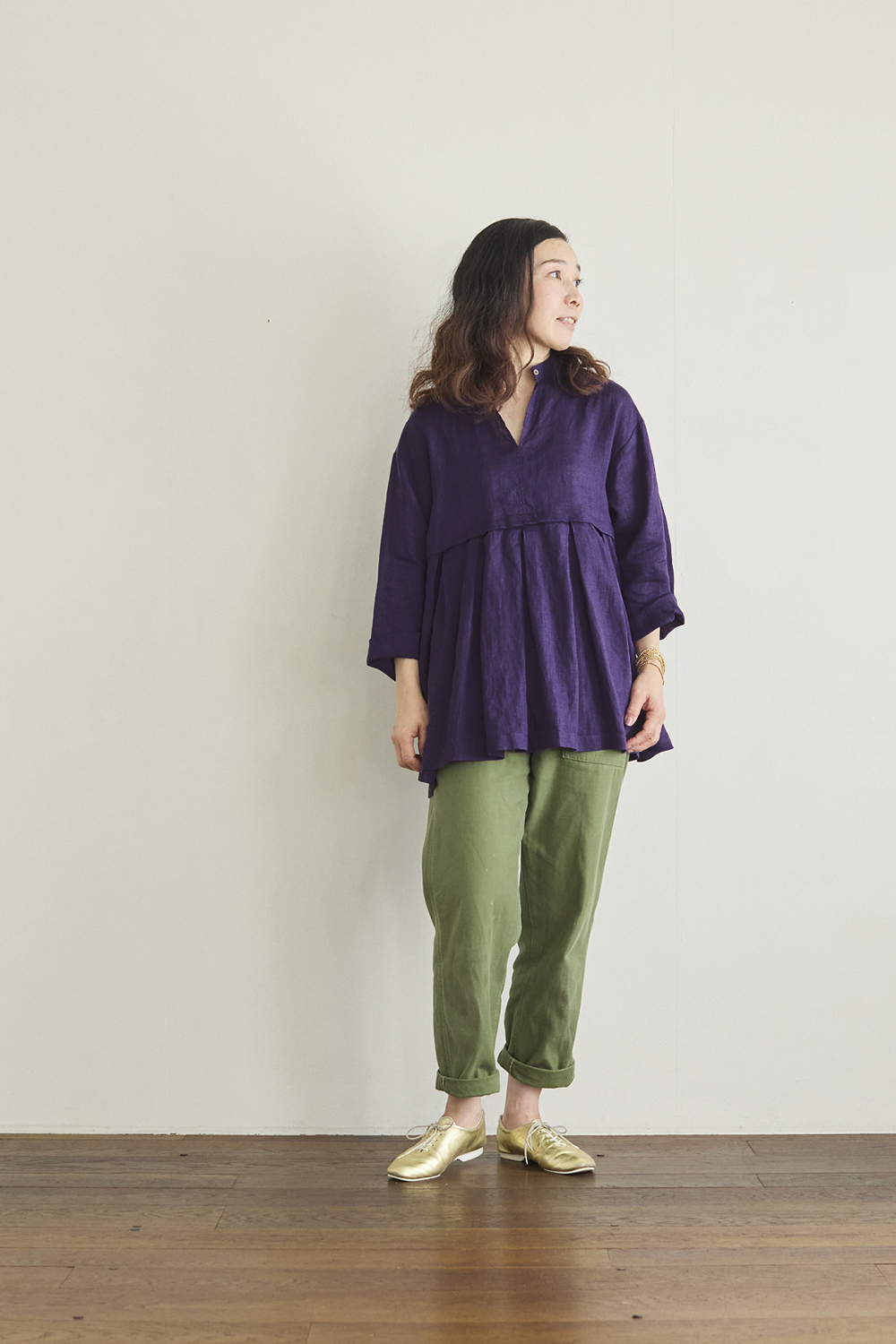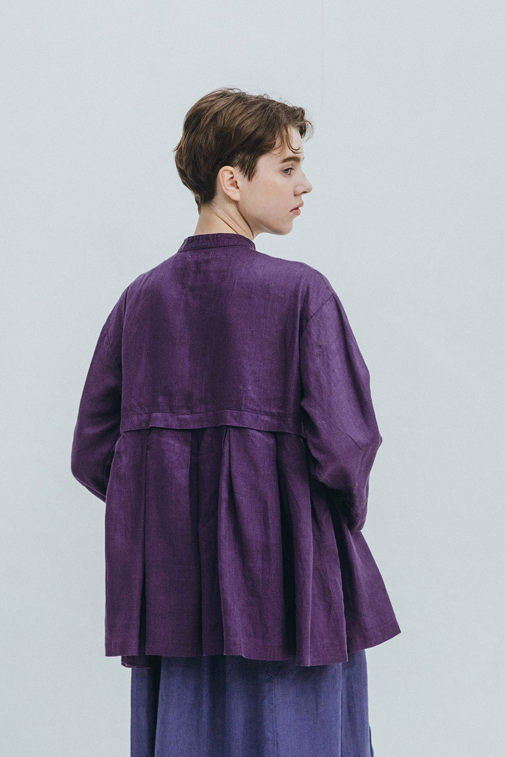 左:身長161㎝ 「きれいなパープルカラーが目を引く一枚。シンプルなコーディネートに取り入れるだけで、ぐっと華やかな印象になります。派手すぎない落ち着いた色味なので、大人っぽく着こなせるのもポイント。差し色としても主役としても活躍してくれそうです。首元のボタンは開けるとラフに、しめるときちんとした感じになります」