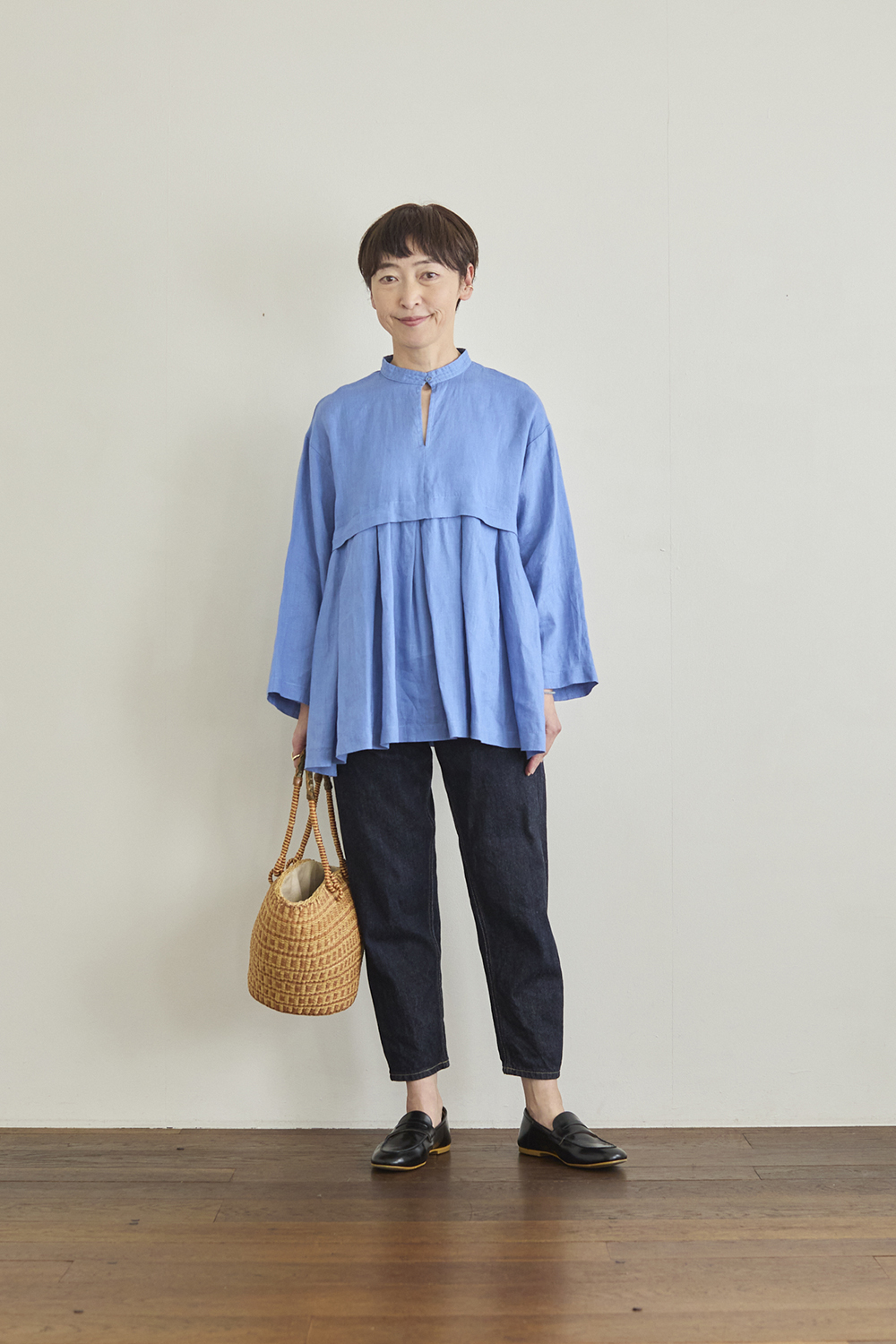 右:身長160㎝ 「顔周りをぱっと明るく見せてくれる、清潔感のあるブルーがかわいいブラウス。ボリュームがあって、1枚でコーディネートが完成するので、デニム合わせでシンプルな着こなしにしました」
