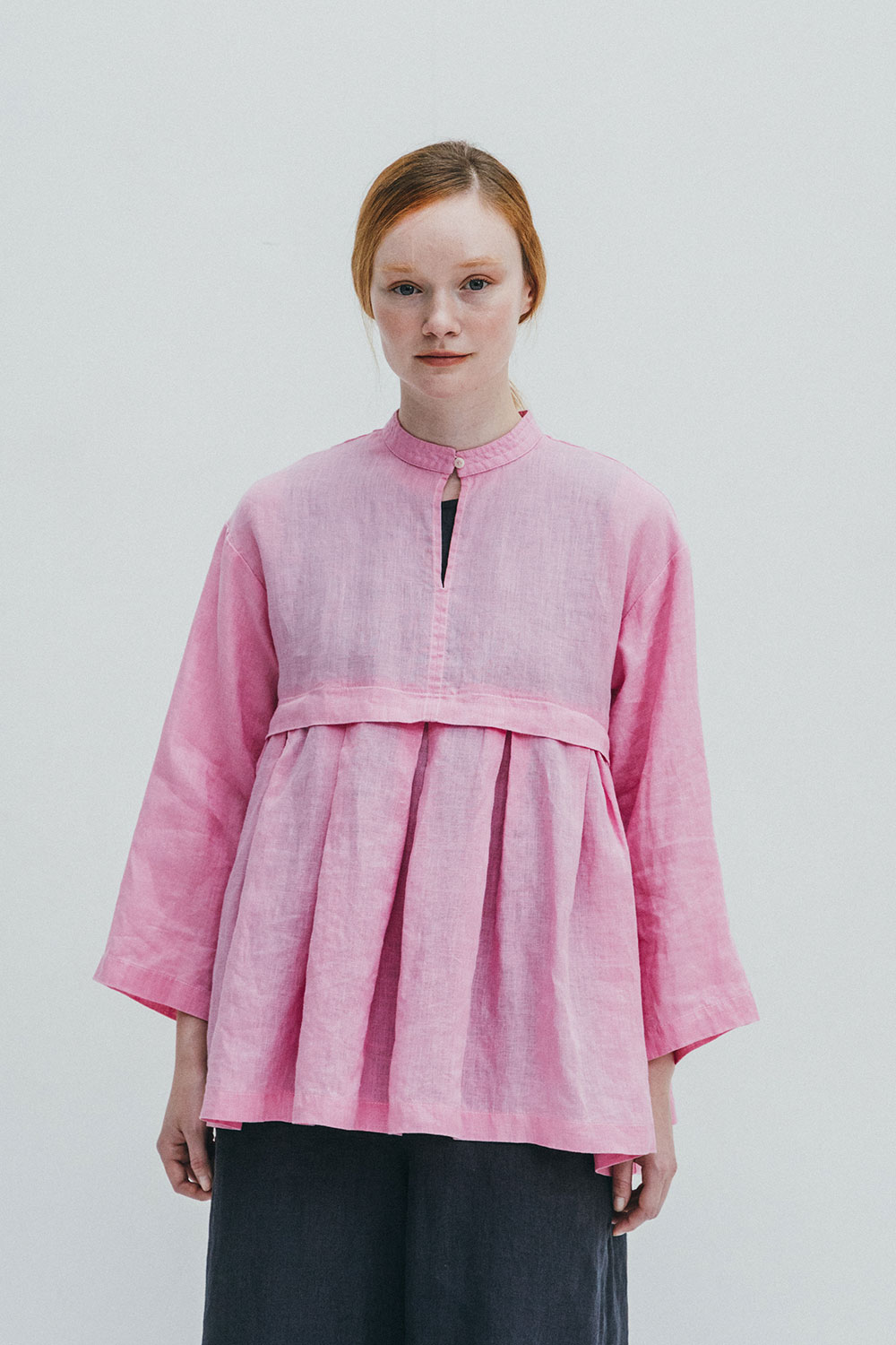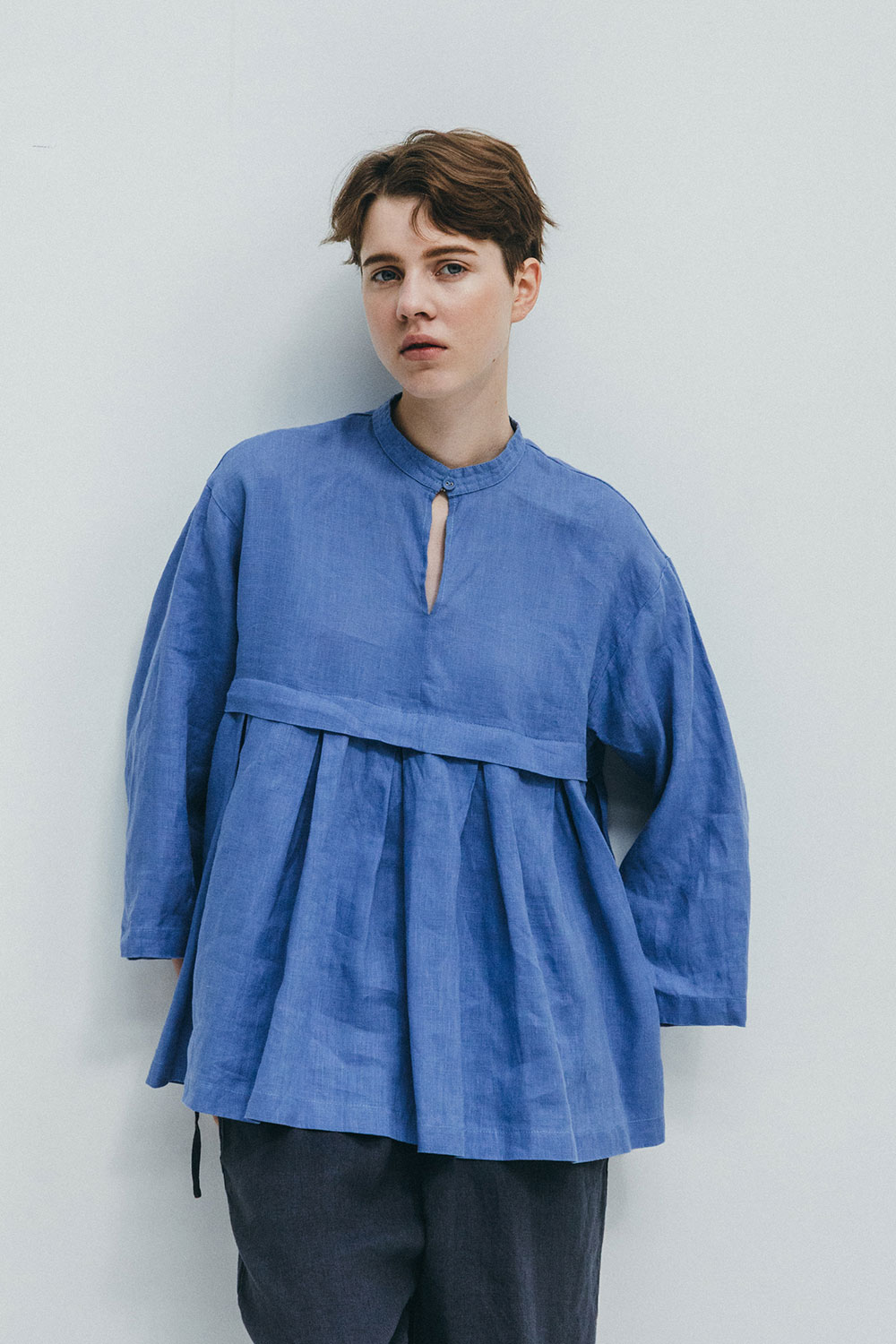 ハイウエスト位置で切り替えを入れ、タックを施してふんわりとしたボリュームをもたせたブラウス。