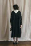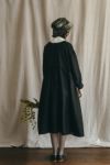 身長153㎝ 「前後で雰囲気が変わるので、その日の気分で着られるのが楽しいワンピースです。今回はVネック側を前にして、ネックレスをあわせてちょっとドレッシーな印象で着用してみました。私が着用すると足首がすこし見えるくらいの着丈で、ブーツやソックス合わせもかわいいと思います」